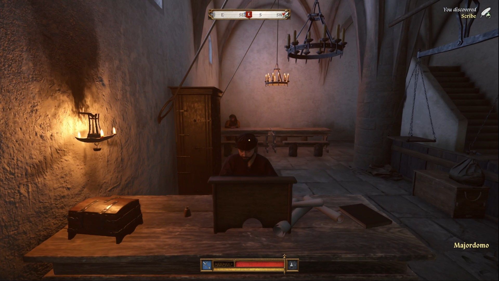 Ubierzcie się w otrzymany strój pacholika i porozmawiajcie z majordomem w ratuszu nieopodal - wybierzcie jedną z wymówek, czemu Franek nie jest w stanie dziś pracować. Majordom wytłumaczy wam, na czym polegać mają wasze obowiązki - stać obok stołu z winem, polewać radnym tylko, kiedy o to proszą, pod żadnym względem nie polewać panu Adamowi, robić wszystko, o co poproszą was radni i nie zadawać zbędnych pytań ani nie szukać wymówek. Gdy będziecie gotowi, potwierdźcie swoją gotowość majordomowi.