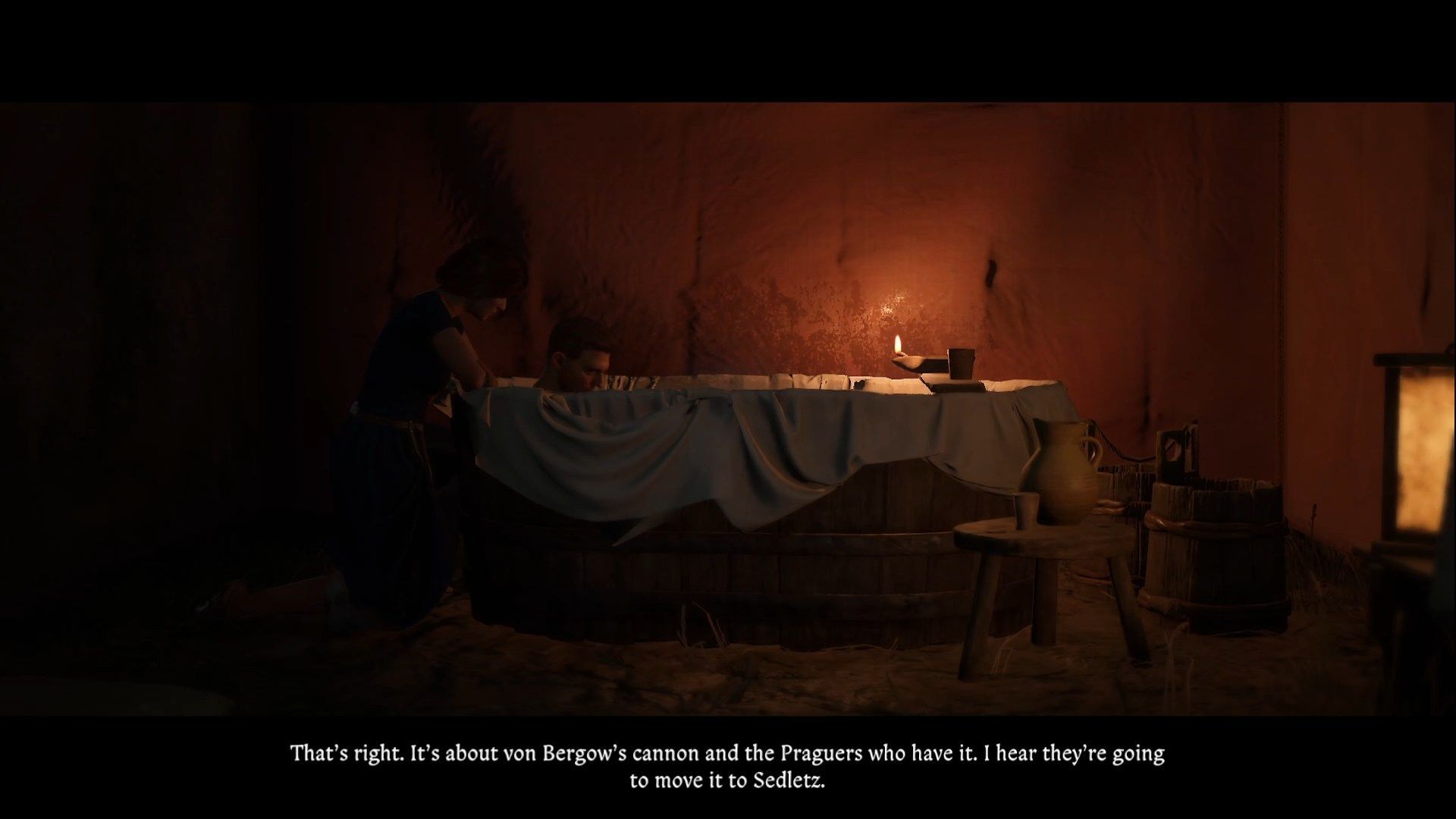 Wewnątrz obozu porozmawiajcie z Katarzyną w łaźniach i wróćcie do niej wieczorem, po godzinie 21. Podczas kąpieli przedyskutujecie dalsze plany - możecie też flirtować z rozmówczynią poprzez testy na Retorykę (Średni i Trudny). Następnie porozmawiajcie ze Stefanem Wroną - możecie popisać się przed nim testami na umiejętności (Alchemia i Rzemiosło - Średni, Sztuka Walki i Złodziejstwo - Bardzo Trudny). Ostatecznie Wrona zabierze was do dowódcy Katza, gdzie otrzymacie zadanie - znaleźć zaginiony dokument.