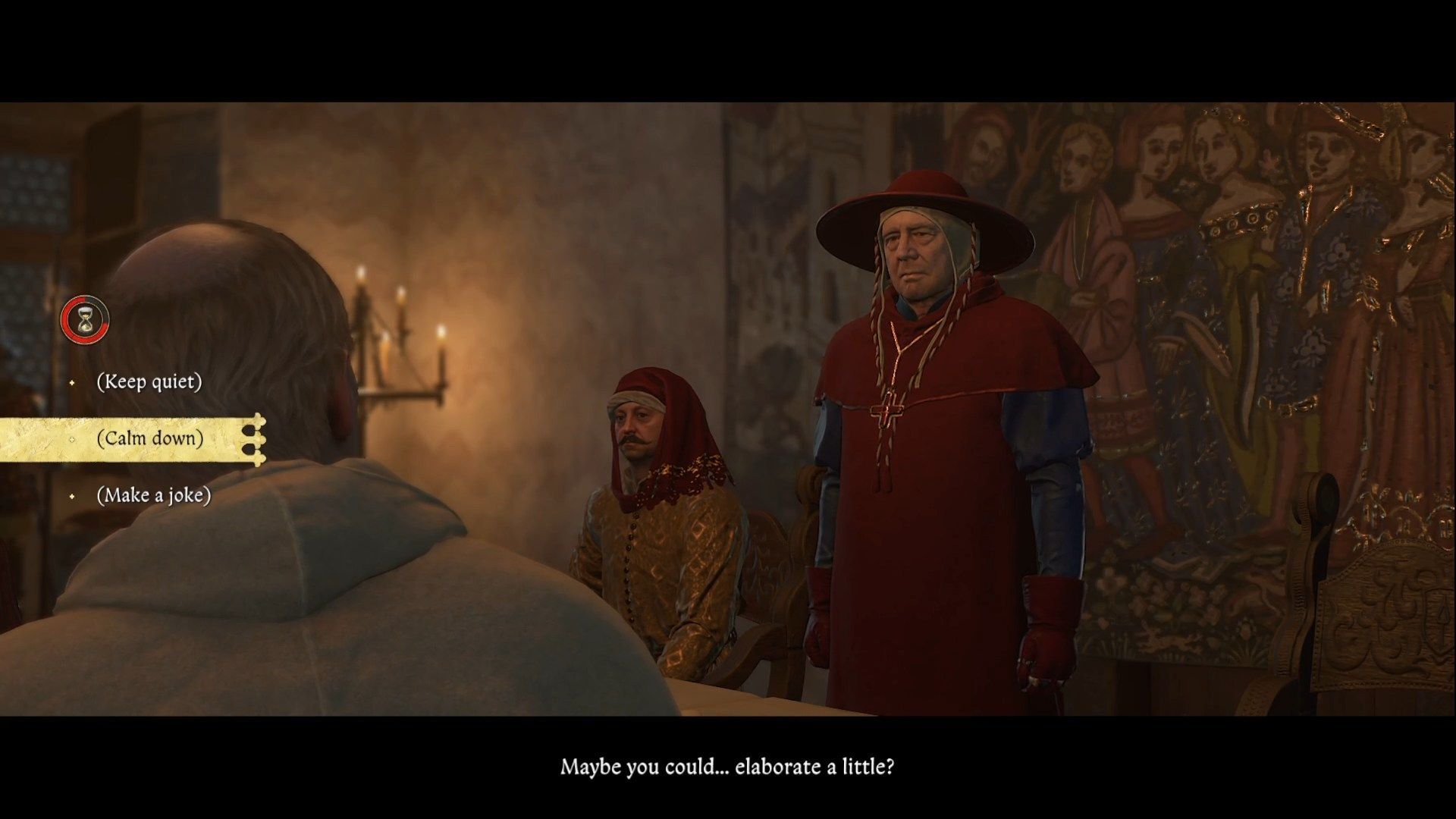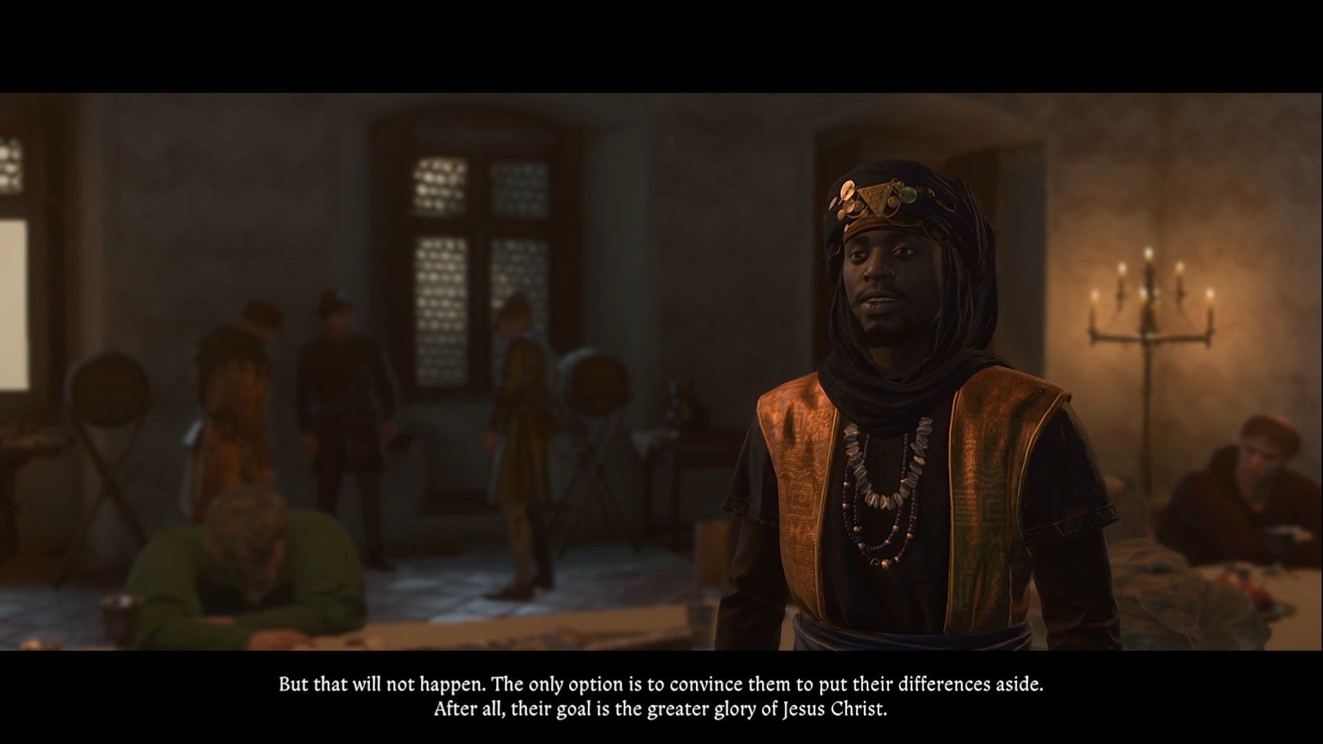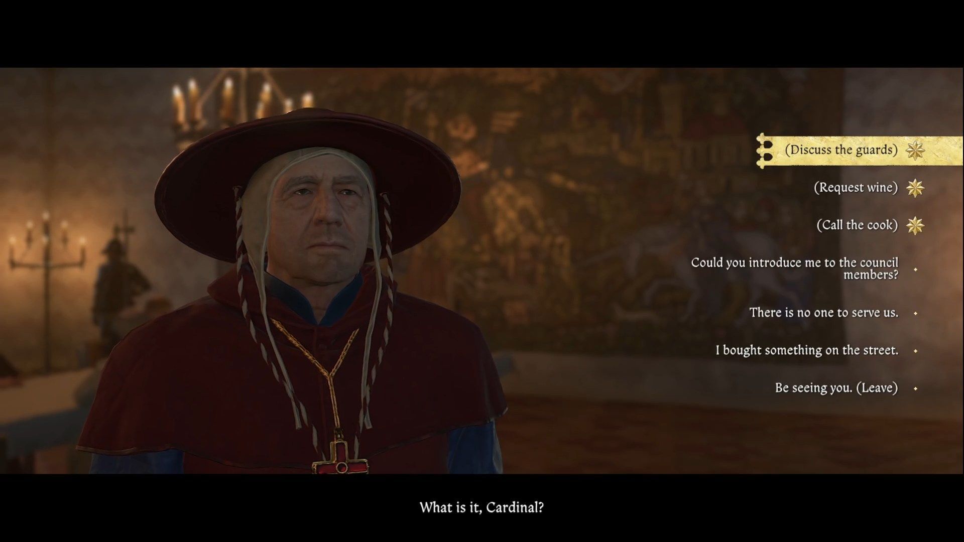 Podczas rady macie dwa główne zadania: bez podejrzeń rozwiązać spór między dwoma stronami i ułatwić Henrykowi jego część planu. Boguta musi również cały czas być w stanie lekkiego podpicia - jeśli będzie trzeźwy lub kompletnie pijany, zapomni jak mówi się łacińskim i zdradzi się. Zwracajcie uwagę na znacznik podpicia przy waszym pasku zdrowia, i w razie potrzeby napijcie się alkoholu lub wypijcie eliksir otrzeźwiający. Na początku rozmowy powiedzcie, że papież nie podjął jeszcze decyzji, kogo wesprzeć.