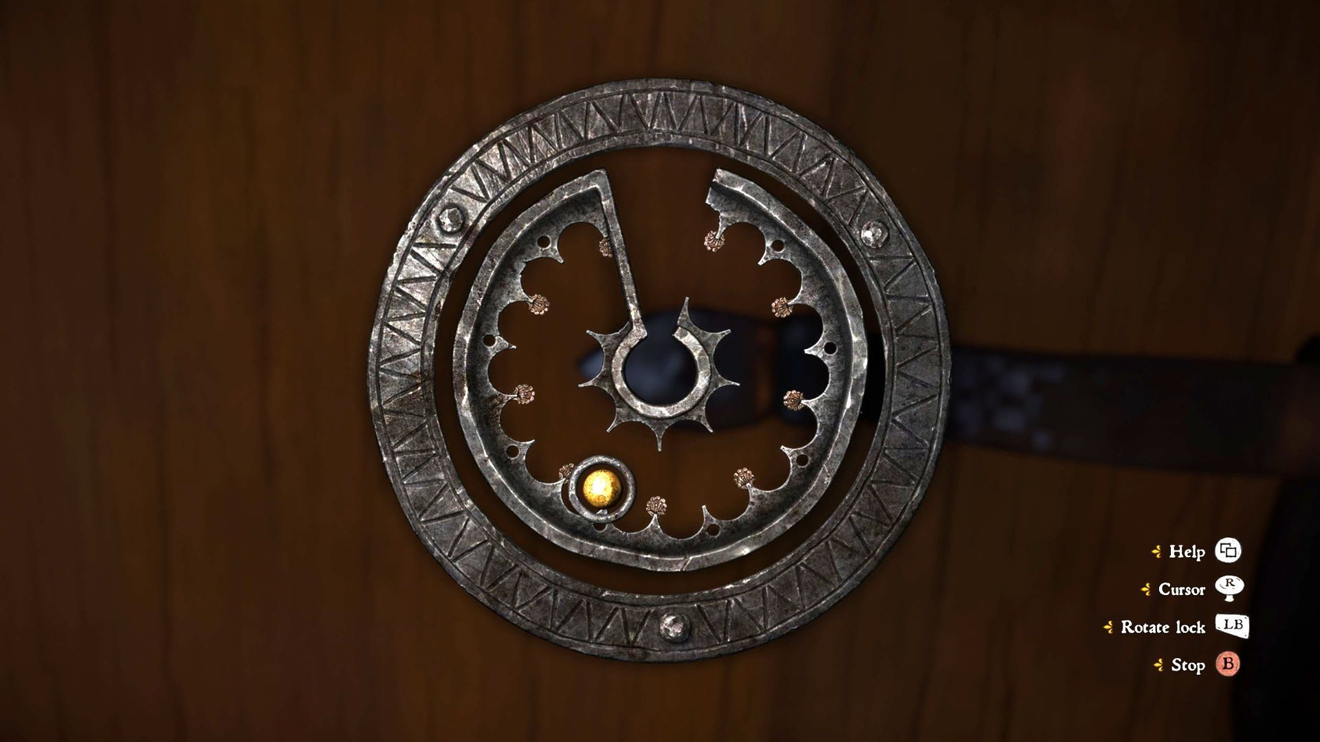 - Mini-gra z otwierania zamków wymaga dużego wyczucia, tak więc przeznaczcie trochę czasu na jej poćwiczenie. Musicie zawsze zacząć od ustalenia miejsca umieszczenia wytrycha w słabym punkcie zamka, czyli zatrzymać kursor w miejscu pojawienia się złotej kuli (przykład na powyższym obrazku). Jeszcze ważniejsze jest bezbłędne przemieszczanie złotego kursora w momencie przekręcania całego mechanizmu w celu zachowania jego idealnego położenia w zamku. Możecie zatrzymać obracanie mechanizmu jeśli przeczuwacie, że jest blisko złamania wytrycha (tj. zgubiliście całkowicie jego prawidłowe położenie), ale musicie ją wtedy rozegrać od nowa.