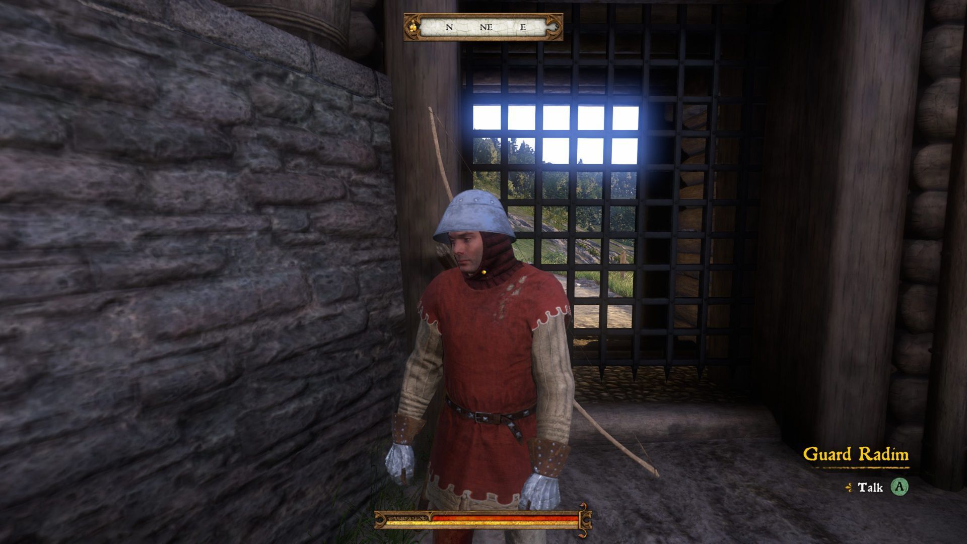 - Innym rozwiązaniem jest wydostanie się z zamku przez główną bramę. Porozmawiajcie z pilnującym jej strażnikiem Radimem. Kategorycznie odmówi, ale możecie nakłonić go do zmiany stanowiska polegając na unikalnych opcjach dialogowych. Najskuteczniejsze będzie użycie perswazji, gdyż Radim ma tylko 3 punkty przy tym parametrze. Dowiecie się, że Radim może wypuścić Henryka z zamku jeśli ten będzie wyglądał jak strażnik z Talmberku.