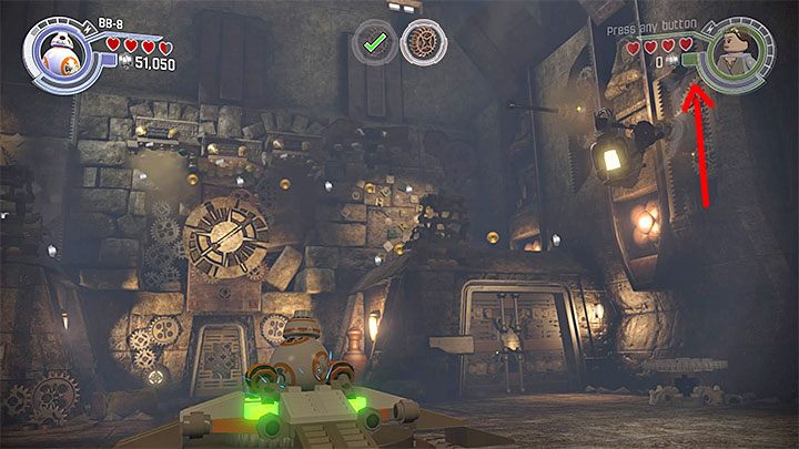 Przejdź na sam koniec głównego pomieszczenia zamku i wysłuchaj komentarza na temat problemów przy barze. Wejdź w interakcję z nowymi podskakującymi klockami i zbuduj z ich pomocą obrotowy mechanizm po prawej stronie. Z mechanizmu tego może skorzystać wyłącznie Rey i akcja ta odsłoni mały właz. Przełącz się na BB-8 i przejedź przez tę małą dziurę.