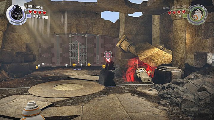 Lokalizacja i sposób odblokowania: Na poszukiwania minizestawu wyrusz na lewo od miejsca startu. Użyj jasnej lub ciemnej strony Mocy żeby odblokować zaznaczone na obrazku lewe przejście. Po przeniesieniu się do nowego obszaru poniszcz obiekty z otoczenia i następnie wejdź w interakcję z klockami multibudowy. Zbuduj gniazdo w samym środku pomieszczenia i umieść na nim np. BB-8 żeby odblokować skrytkę z sekretem.
