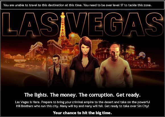Las Vegas nie jest dostępne od samego początku gry. W celu odblokowania tej lokacji musisz awansować na co najmniej 18 poziom doświadczenia. Do tego czasu przy próbie wybrania się do Las Vegas gra będzie wyświetlała powyższą planszę. Z lokacją tą wiążą się dwie zasadnicze zmiany. Najważniejsza z nich polega na tym, że całość zbudowana jest na zasadzie dystryktów (w sumie jest ich osiem), do których sukcesywnie uzyskuje się dostęp.