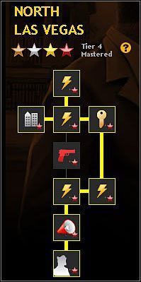 Drugą istotną zmianą jest sposób zaliczania zadań w Las Vegas, gdyż całość prezentowana jest w formie drzewka. Przykładowe drzewko z pierwszego dystryktu Las Vegas pokazane zostało na powyższym screenie. Zmagania rozpoczyna się w górnej części drzewka, a kończy w dolnej, zawsze będącej pełnoprawną walką z bossem danej lokacji. W pokazanym na screenie przykładzie do celu prowadzą dwie ścieżki, ale niekiedy mogą to być nawet trzy. Gra pozwala na dobór ścieżki zgodnie z preferowanym stylem gry. Dotarcie na dół drzewka i zabicie bossa doprowadza do odblokowania kolejnego dystryktu. BARDZO ważną informacją jest to, że pokonanie bossa doprowadza do "wymasterowania" całej lokacji. Jeżeli więc po drodze nie zaliczyłeś jakichś zadań, a masz taki zamiar, to warto wstrzymać się z rozpoczęciem pojedynku z bossem do momentu ich zaliczenia. Ja radzę oczywiście zaliczyć wszystkie zadania, szczególnie na niższych poziomach (brązowy i srebrny), gdyż dzięki temu zdobywa się cenne punkty umiejętności (Skill Points).