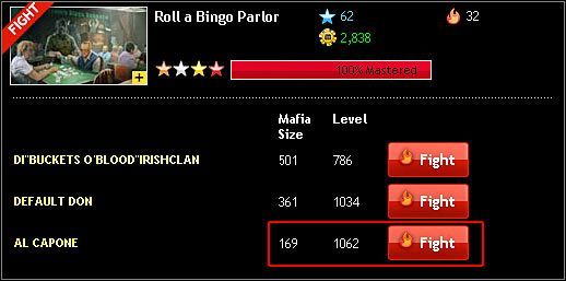 Trzy rodzaje zadań z tabelki wymagają szerszego objaśnienia. Zadania symbolizowane przez ikonę pistoletu zakładają używanie jednostek wytrzymałości (Stamina). Funkcjonują one na zbliżonych zasadach do normalnych walk (więcej na ten temat w dalszej części poradnika), tyle że same pojedynki są niejako "wirtualne". Tak naprawdę nie atakujesz drugiego gracza, a jedynie symulujesz walkę z nim. Najważniejsze jest to, by pamiętać o atakowaniu słabszych od siebie graczy, tak by w miarę możliwości zawsze wygrywać. Gra zazwyczaj pokazuje trzy propozycje i możesz zdecydować się na jedną z nich. ZDECYDOWANIE radzę zwracać uwagę na współczynnik Mafia Size (Wielkość mafii), gdyż to głównie on decyduje o szansach na powodzenie. Dla przykładu, jeżeli liczebność Twojej mafii wynosi 300 osób, dla zagwarantowania sobie sukcesu warto atakować tylko tych graczy, których liczebność mafii nie przekracza 200 osób. Mniejszą uwagę możesz przywiązywać natomiast do parametru Level (Poziom doświadczenia). Uwaga! Jeżeli na liście znajdują się jedynie gracze z licznymi mafiami przeładuj ekran zadań, a gra powinna wylosować nowe osoby. Próbuj tak długo aż na liście propozycji znajdzie się co najmniej jeden słabszy gracz.
