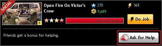 Drugi typ zadań wymagającego dokładniejszego omówienia to pozycje symbolizowane przez ikonę megafonu. Cechują się one tym, że kładą duży nacisk na współpracę ze znajomymi. Klikając na przycisku Ask for Help (Poproś o pomoc) będziesz mianowicie mógł poprosić o wsparcie w zaliczeniu takiego zadania. Pamiętaj o tym, że nie musisz pozostawiać swojego wpisu na Facebookowej tablicy, gdyż po zamknięciu okna odpowiednia informacja i tak pojawi się w ich oknach wiadomości (o ile oczywiście czytają tego typu zawiadomienia). Nie polecam wykonywać zadań z tej grupy w pojedynkę z uwagi na niekorzystny przelicznik ilości wydanej energii do zdobytego doświadczenia. Wyjątkiem może być sytuacja, w której chcesz pozbyć się zdobytych jednostek energii (na przykład po użyciu paczki z energią), bez poniesienia ryzyka zmarnowania ich dużej ilości.