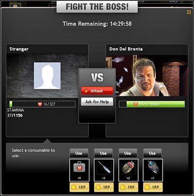 Trzy rodzaje zadań z tabelki wymagają szerszego objaśnienia. Zadania symbolizowane przez ikonę pistoletu zakładają używanie jednostek wytrzymałości (Stamina). Funkcjonują one na zbliżonych zasadach do normalnych walk (więcej na ten temat w dalszej części poradnika), tyle że same pojedynki są niejako "wirtualne". Tak naprawdę nie atakujesz drugiego gracza, a jedynie symulujesz walkę z nim. Najważniejsze jest to, by pamiętać o atakowaniu słabszych od siebie graczy, tak by w miarę możliwości zawsze wygrywać. Gra zazwyczaj pokazuje trzy propozycje i możesz zdecydować się na jedną z nich. ZDECYDOWANIE radzę zwracać uwagę na współczynnik Mafia Size (Wielkość mafii), gdyż to głównie on decyduje o szansach na powodzenie. Dla przykładu, jeżeli liczebność Twojej mafii wynosi 300 osób, dla zagwarantowania sobie sukcesu warto atakować tylko tych graczy, których liczebność mafii nie przekracza 200 osób. Mniejszą uwagę możesz przywiązywać natomiast do parametru Level (Poziom doświadczenia). Uwaga! Jeżeli na liście znajdują się jedynie gracze z licznymi mafiami przeładuj ekran zadań, a gra powinna wylosować nowe osoby. Próbuj tak długo aż na liście propozycji znajdzie się co najmniej jeden słabszy gracz.