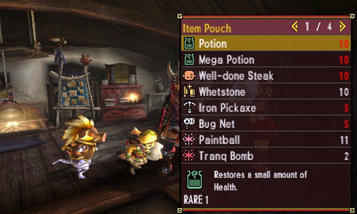 Przed opuszczeniem wioski powinniśmy założyć zbroję oraz uzbroić się w oręże, które w nadchodzącej walce sprawdzi się najlepiej. Praktycznie każdy potwór włada jakimś żywiołem (lub nawet kilkoma) oraz jest na jakiś żywioł wrażliwy i/lub posiada odporność na inny - takiej informacji najlepiej zasięgnąć przed walką z odpowiedniego źródła internetowego. Jest to typowa gra w papier-kamień-nożyce. Oczywiście nie oznacza to, że zabranie ze sobą broni wzmocnionej nieodpowiednim żywiołem oraz zbroi z nieodpowiednimi odpornościami uniemożliwi nam wykonanie zadania, ale stanie się ono dużo trudniejsze.