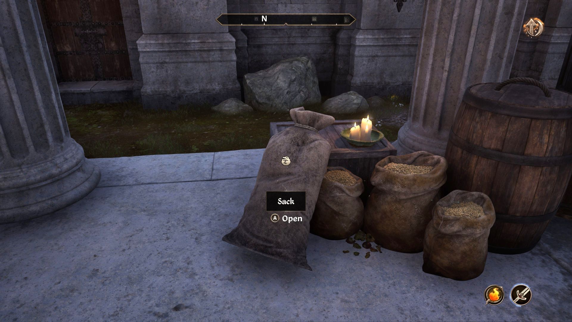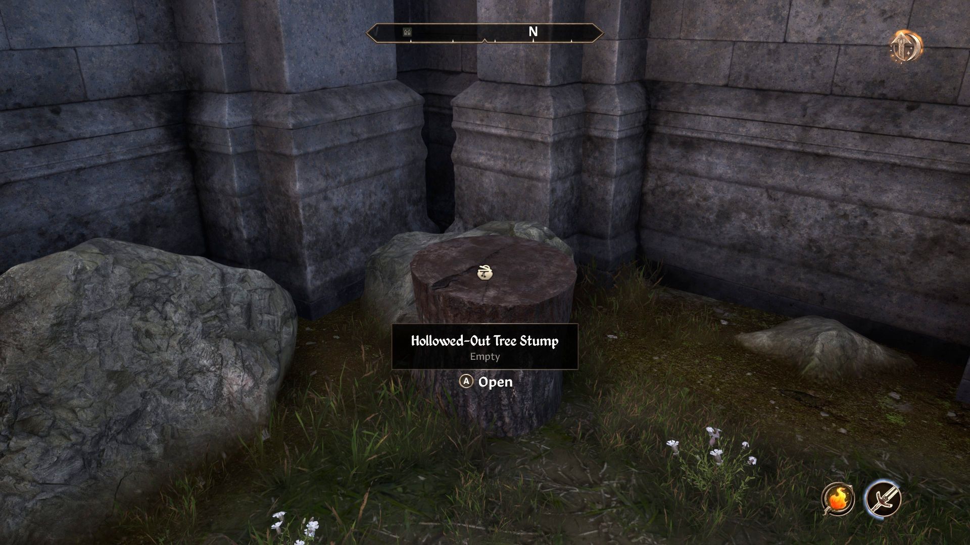 - Dotrzyjcie do małego dziedzińca ze studnią na tyłach sklepu Kostury Rindira w dzielnicy handlowej miasta. Znajdziecie tu pniak z obrazka. Jest on domyślnie pusty i śmiało możecie w nim umieszczać przedmioty z inwentarza.