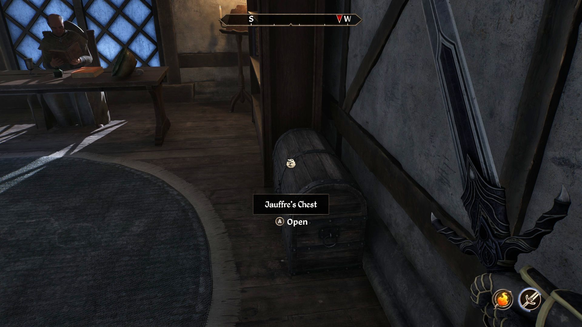 - Po dotarciu na miejsce musicie wejść do Domu Weynon. We wspomnianym głównym zadaniu bohater może poprosić Jauffre'a o wsparcie (powyższy obrazek). Spowoduje to odblokowanie dostępu do kufra Jauffre'a.