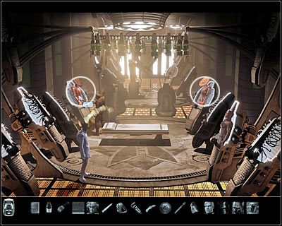 Teraz postępuj zgodnie z przedstawionym przeze mnie schematem. Spróbuj porozmawiać z doktorem, ponownie przeciągając na jego postać ikonę lalki. Następnie skieruj się do znajdującego się po prawej mężczyzny. Okaże się, iż nie możesz z nim rozmawiać w towarzystwie doktora. Na koniec zagadaj do pokazanych na screenie dwóch przedstawicieli obcych cywilizacji. Na każdą z tych postaci musisz przeciągać ikonę zdobytej w muzeum kości.