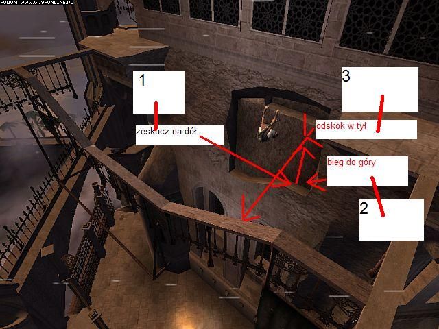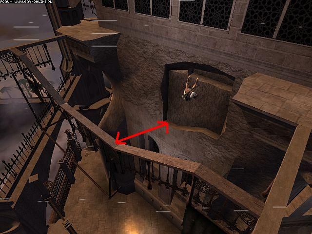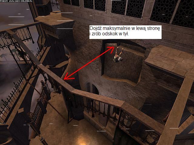 "Aby dostać się na górę, musimy wykorzystać znaną już nam metodę odbijania się od ściany do ściany. Na górze wskakujemy na zawieszony nad przepaścią drążek a później na drewnianą przybudówkę.