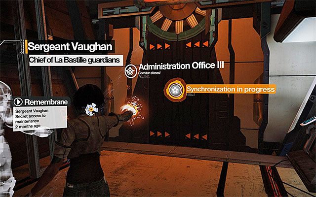 Wyjdź z koszar i podejdź do zlokalizowanego w pobliżu punktu wyświetlenia wirtualnej projekcji. Po załączeniu projekcji wciśnij klawisz/przycisk namierzania i zacznij rytmicznie wciskać klawisz/przycisk interakcji z zamiarem dokonania pełnej synchronizacji. Możesz już otworzyć drzwi prowadzące do nowego pomieszczenia administracyjnego (Administration Office III).