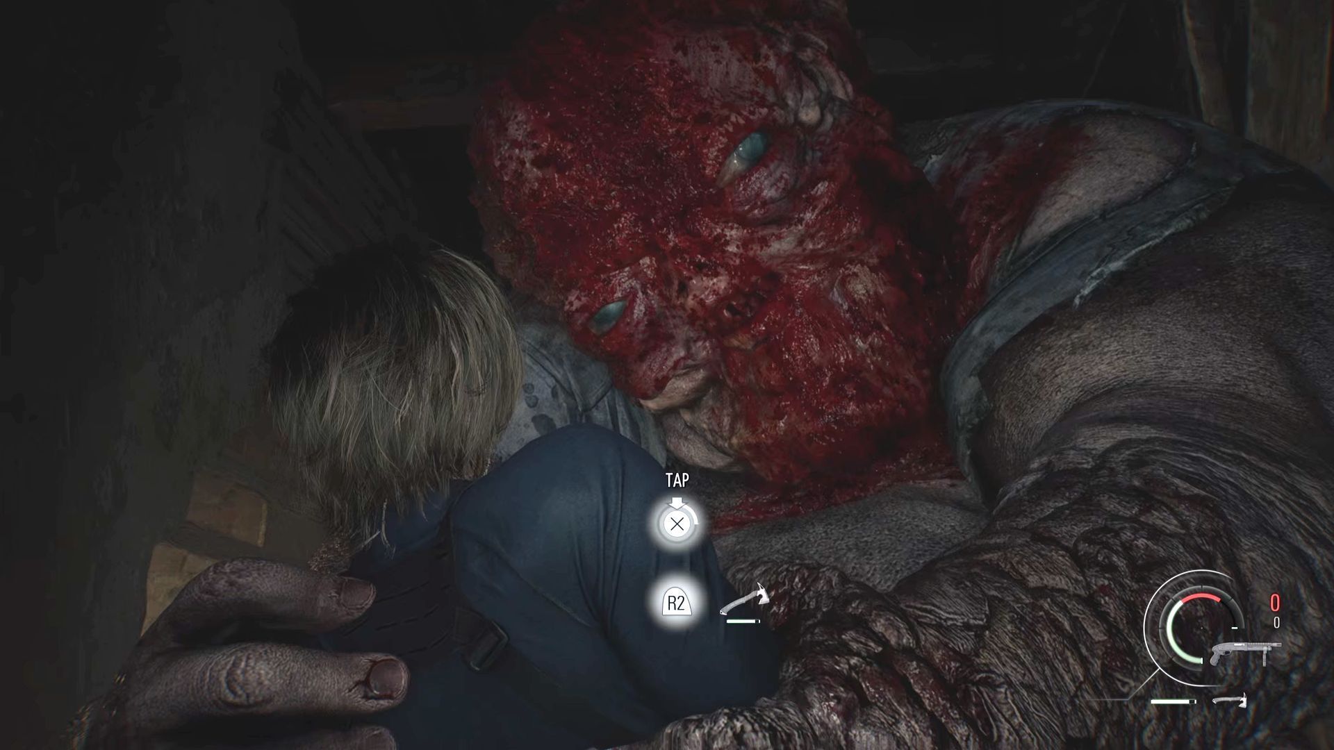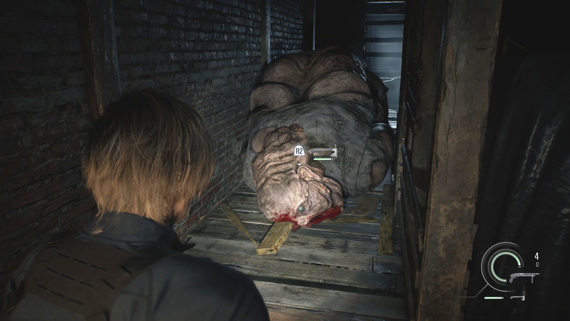 - Używajcie głównie nowo pozyskanej strzelby, bo ma ona o wiele większą siłę rażenia od pistoletu Leona. Celujcie domyślnie w głowę wielkiego potwora i zachowujcie bezpieczny dystans od kreatury.