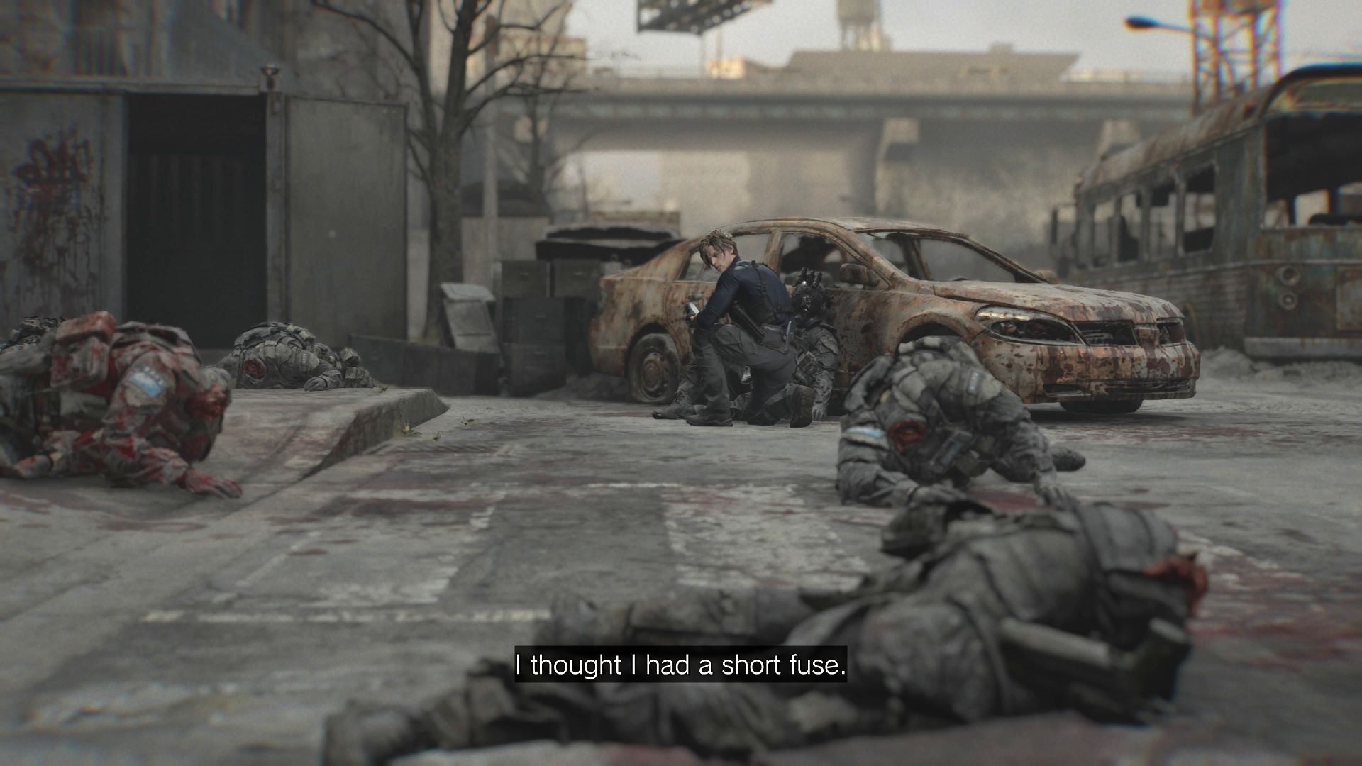 - Musicie awansować dalej w ramach eksploracji wschodniego Raccoon City i doprowadzić do dostarczenia bezpieczników i odblokowania wyjścia z podziemnego garażu. Pozwoli to Wam na eksplorację wschodnich ulic, gdzie natraficie na zwłoki członków oddziału BSAA. Leon zabierze klucz do kontenera i przy okazji obejrzycie nagranie z kamery.