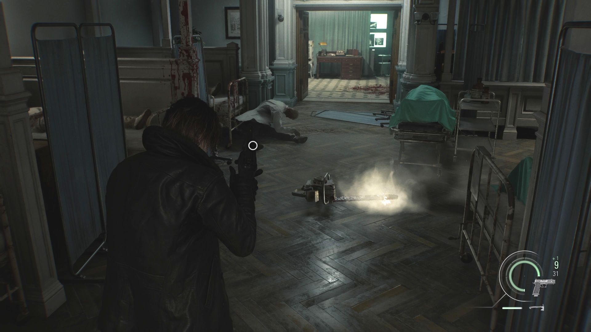 - Okazja do zdobycia i używania piły łańcuchowej po raz pierwszy pojawia się po tym jak Leon zjawi się w Rhodes Hill. Musicie początkowo podążać za pielęgniarką, a po dotarciu do jednego z pomieszczeń biurowych rozpocznie się konfrontacja z zombie lekarzem używającym piły.