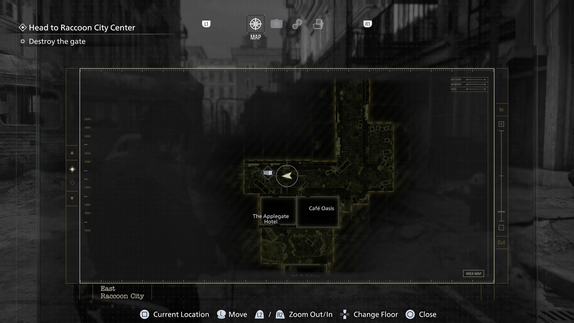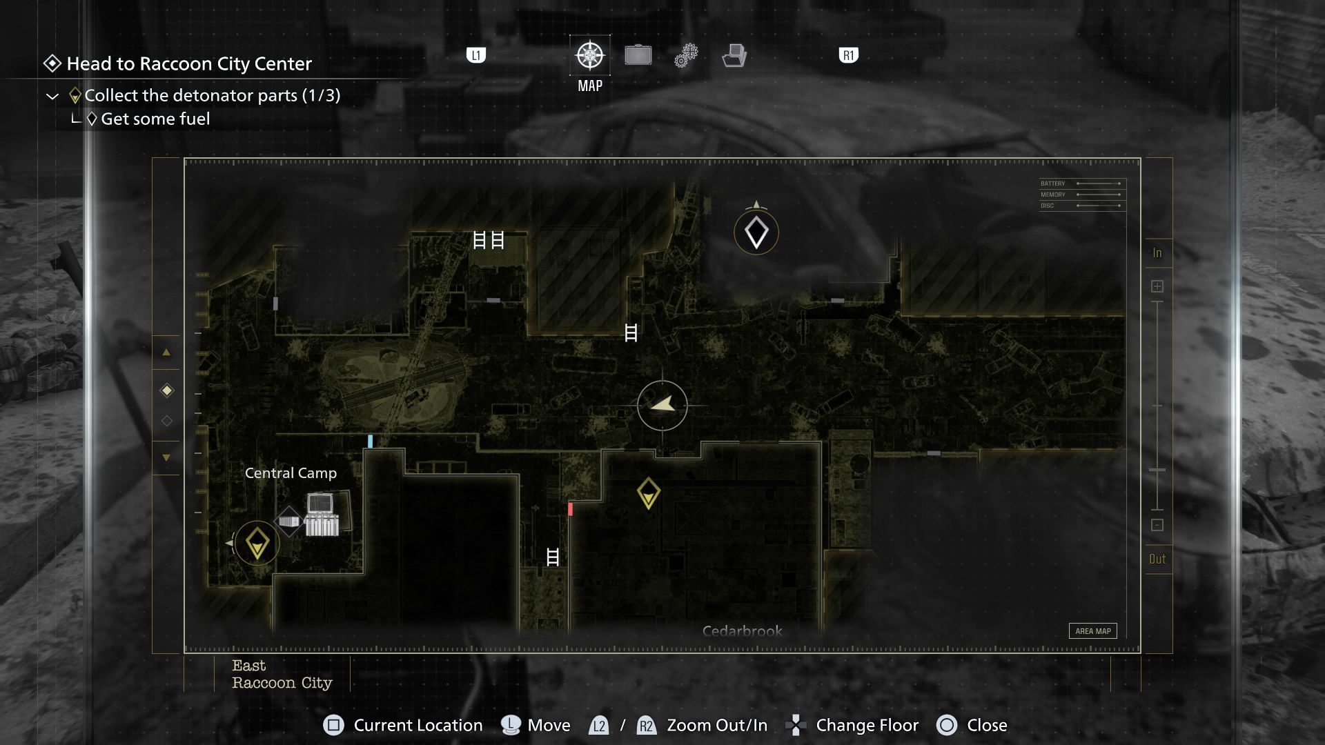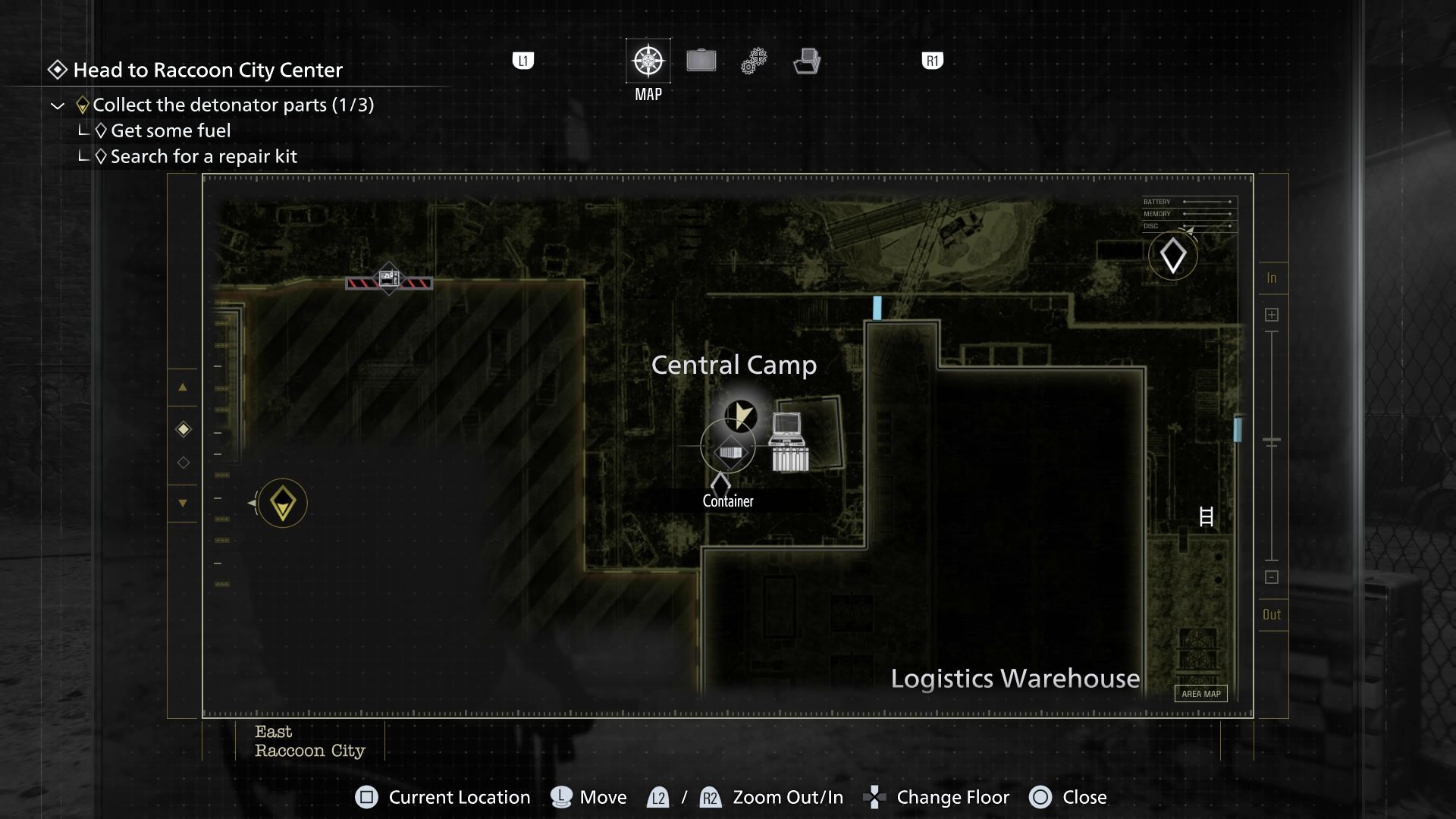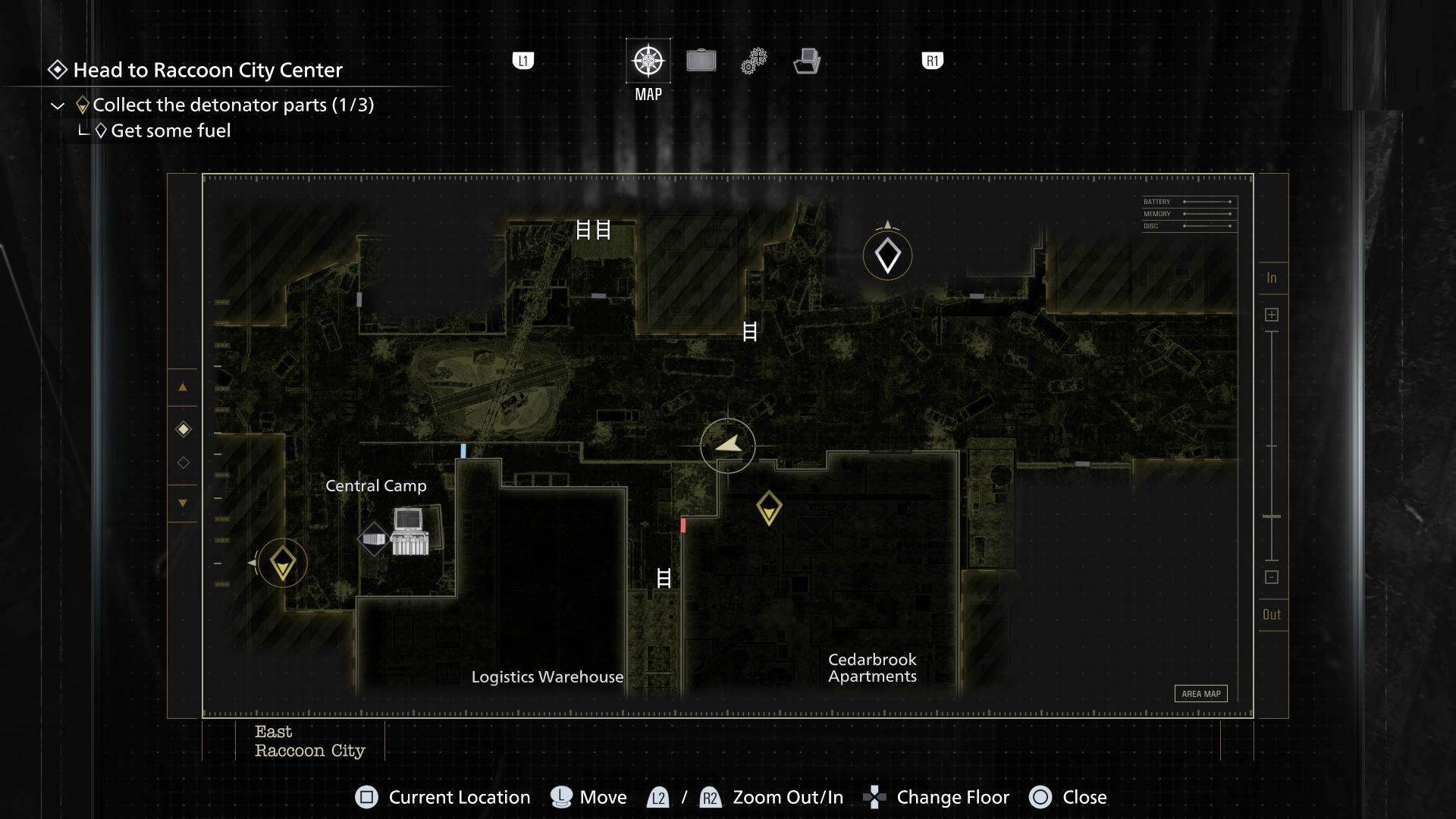 - Awansujcie w rozdziale we wschodnim Raccoon City żeby zdobyć baterie i odblokować nowe wyjście z parkingu podziemnego. Pozwoli to Wam dotrzeć do wschodniej części głównej ulicy biegnącej przez mapę.