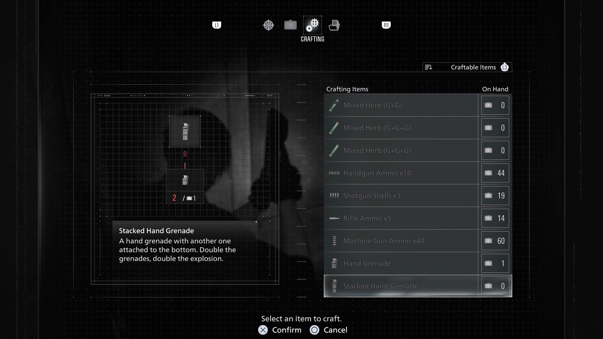 - W przypadku Grace mechanikę craftingu odblokujecie po dotarciu do Ośrodka. Początkowo dostępna jest ona jedynie w ograniczonym zakresie. Możecie m.in. łączyć zioła z poziomu inwentarza, bądź też przejść do osobnej zakładki wytwarzania przedmiotów.