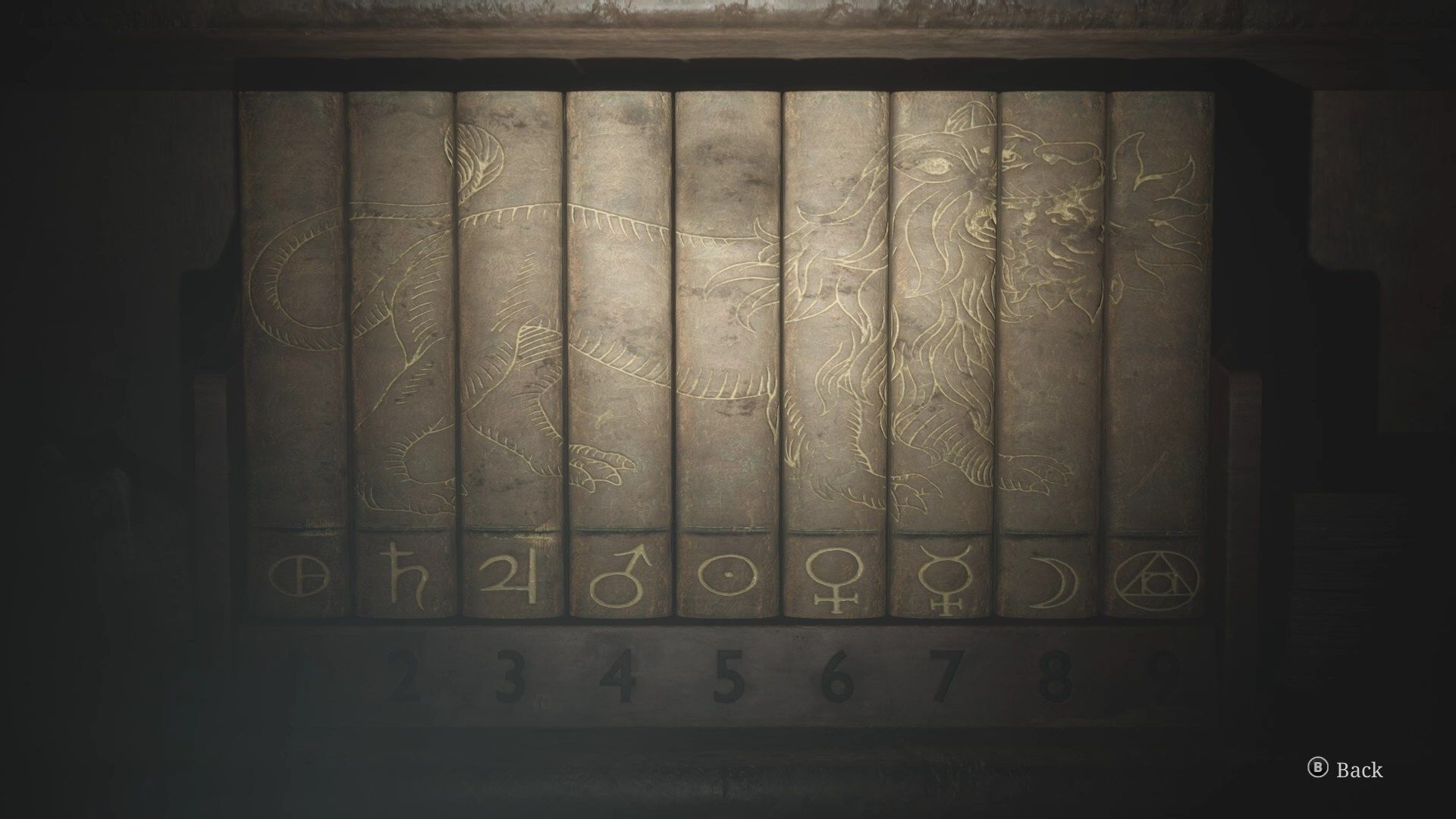 Po otwarciu drzwi zabierzcie brakujący przycisk do sejfu ze stolika i wejdźcie w interakcję z regałem na książki. Na regale znajdują się cyfry, a na grzbietach książek symbole oraz części rysunku. Poprawne ustawienie książek ujawni zatem, jakiej cyfrze odpowiada każdy symbol.