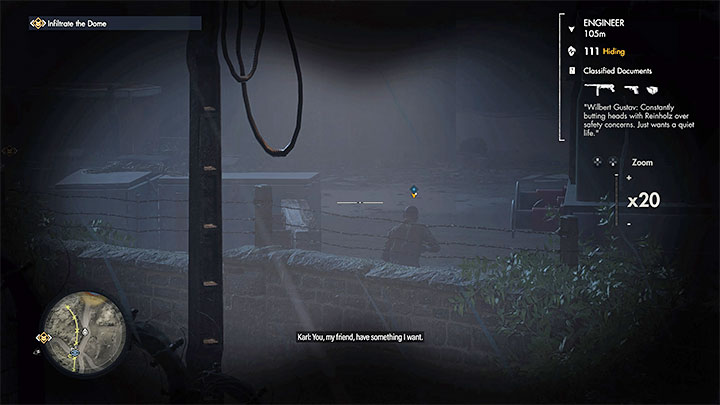 - Zlokalizujcie inżyniera z dokumentem w inwentarzu. Możecie to odczytać używając na nim lornetki (obrazek 1). Pozbądźcie się w dowolny sposób inżyniera i przeszukajcie jego ciało.