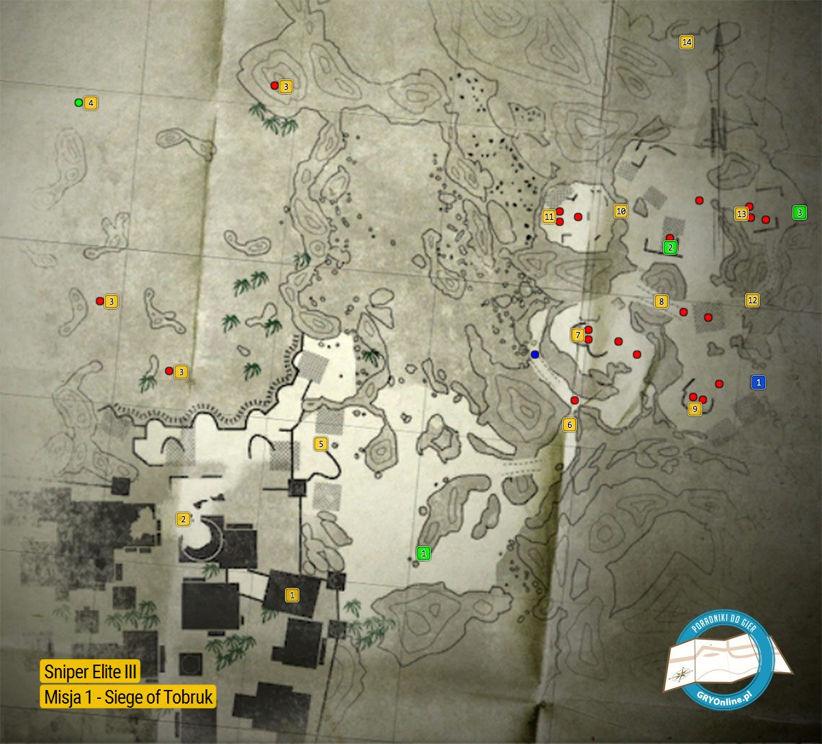Powyższy obrazek prezentuje mapę lokacji, w której rozgrywa się pierwsza misja gry. Są to twierdza Tobruk oraz przylegające do niej tereny górskie. Na mapie zaznaczone zostały przede wszystkim najważniejsze miejsca (cele misji, główne ścieżki itp.) oraz lokalizacje znajdziek (sekretów).