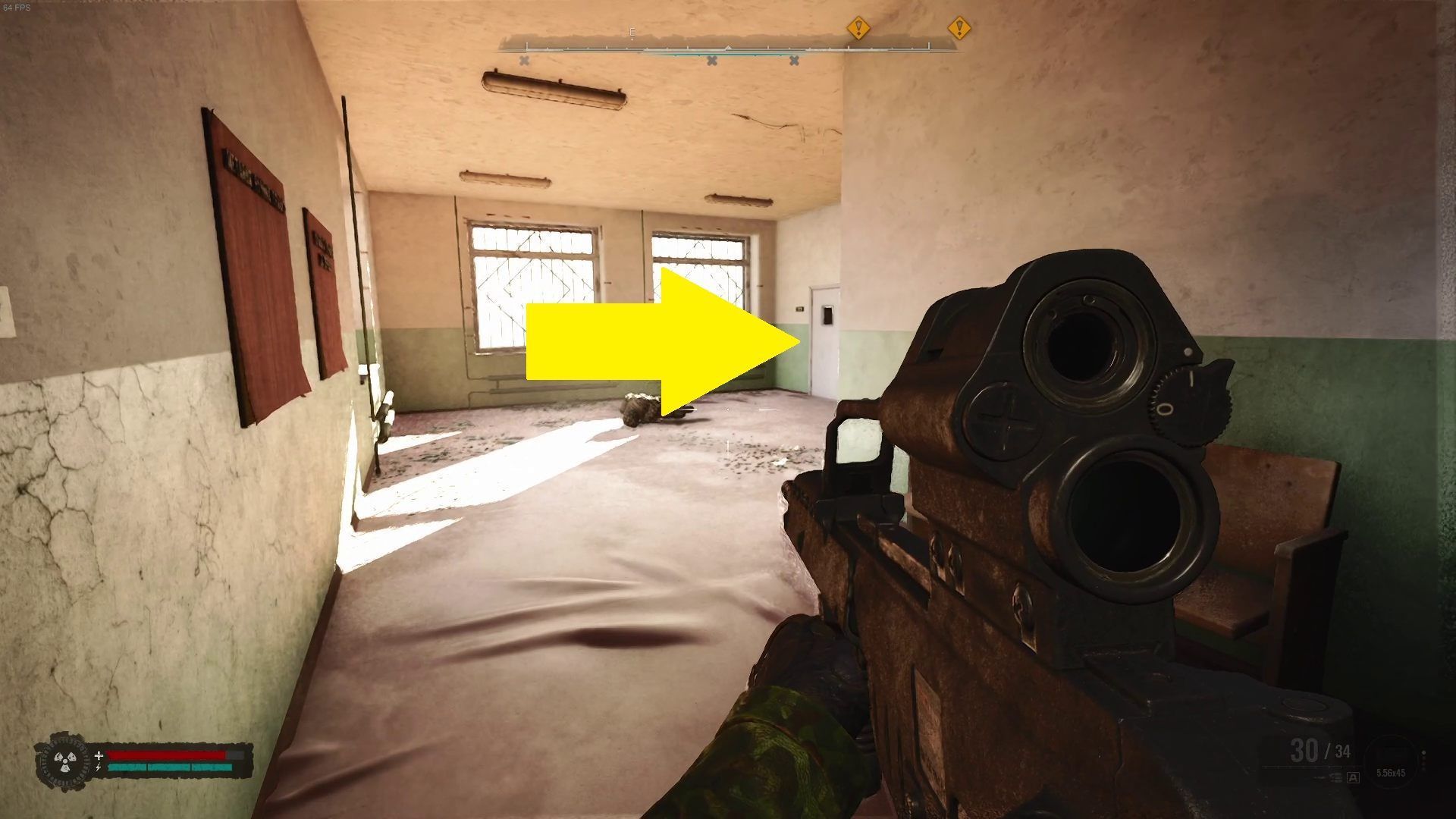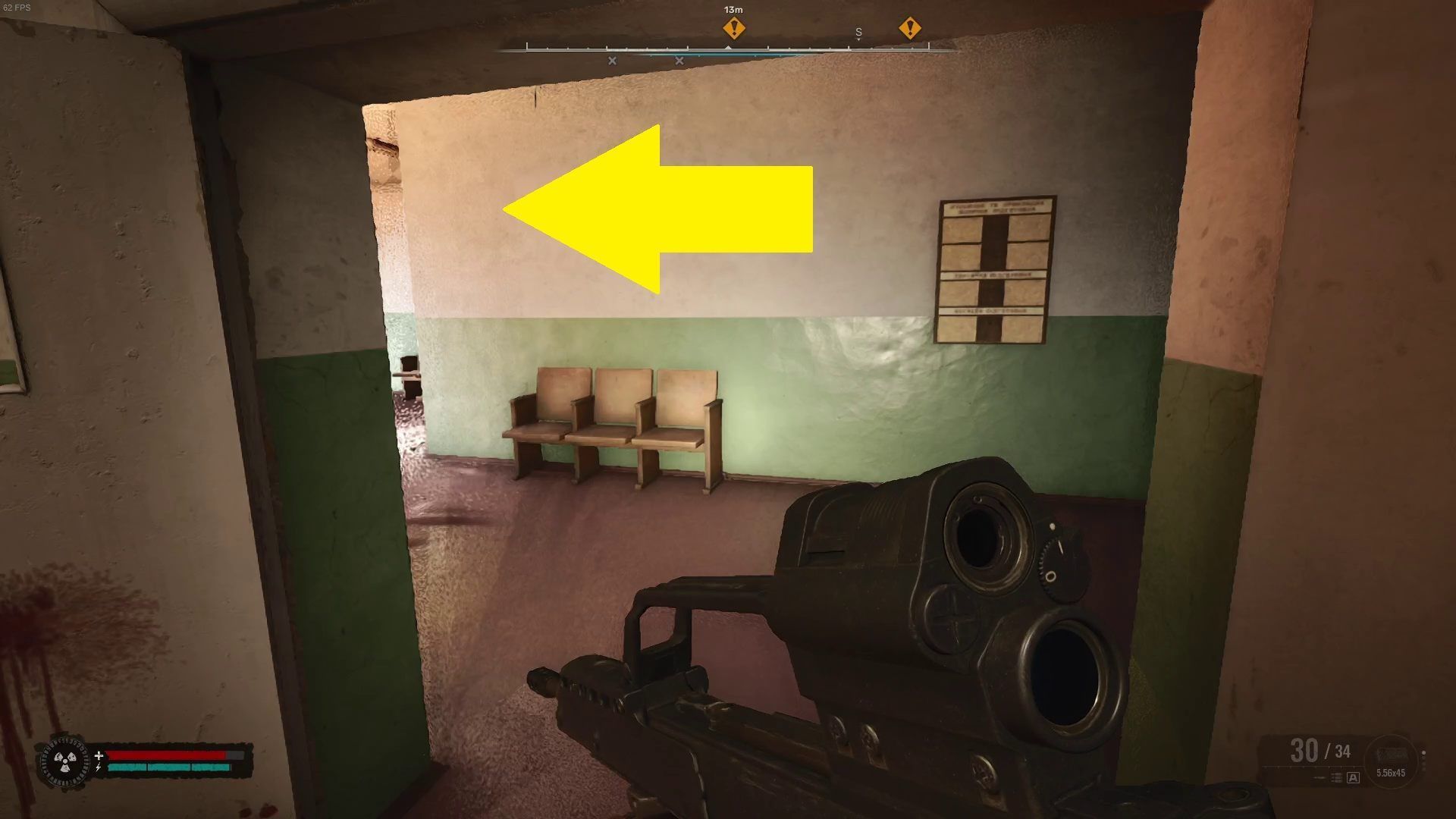 Przejdźcie przez duże pomieszczenie oraz sale z muralem. W zrujnowanej części budynku, wejdźcie po zgliszczach na wyższe piętro.