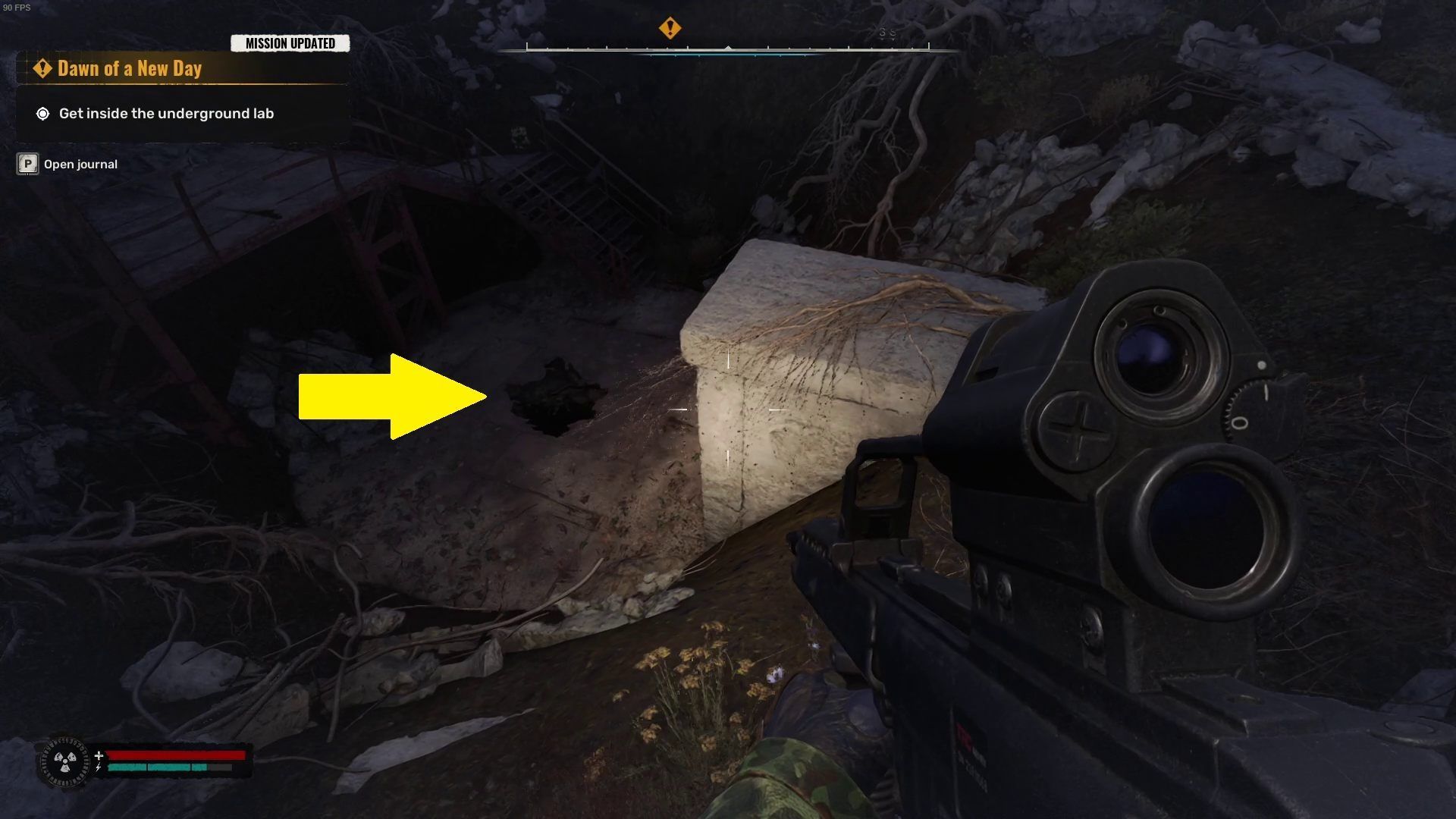 Wejście do placówki znajduje się w kraterze, obok pola anomalii. Wskoczcie do środka przez dziurę w ziemi.