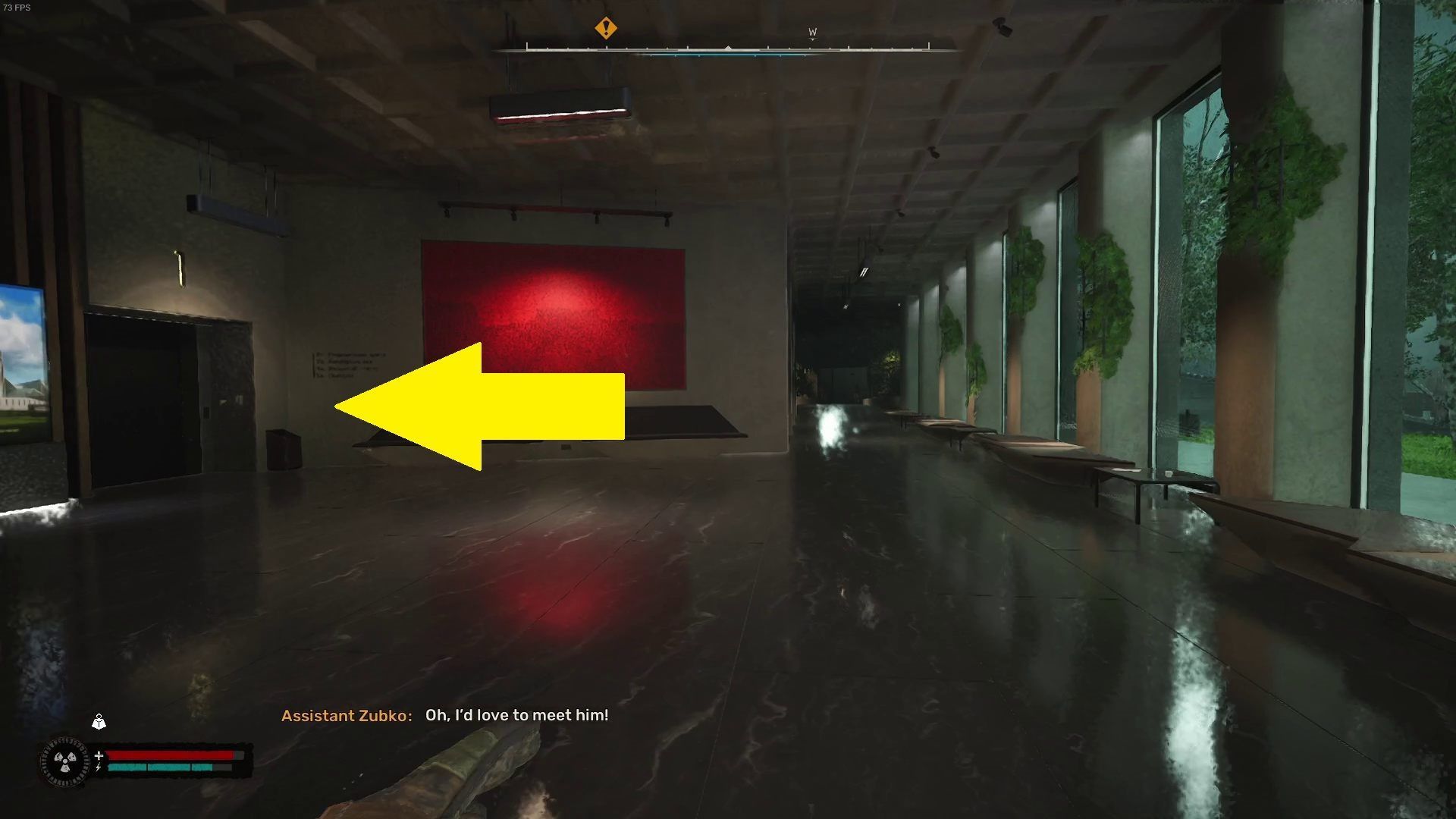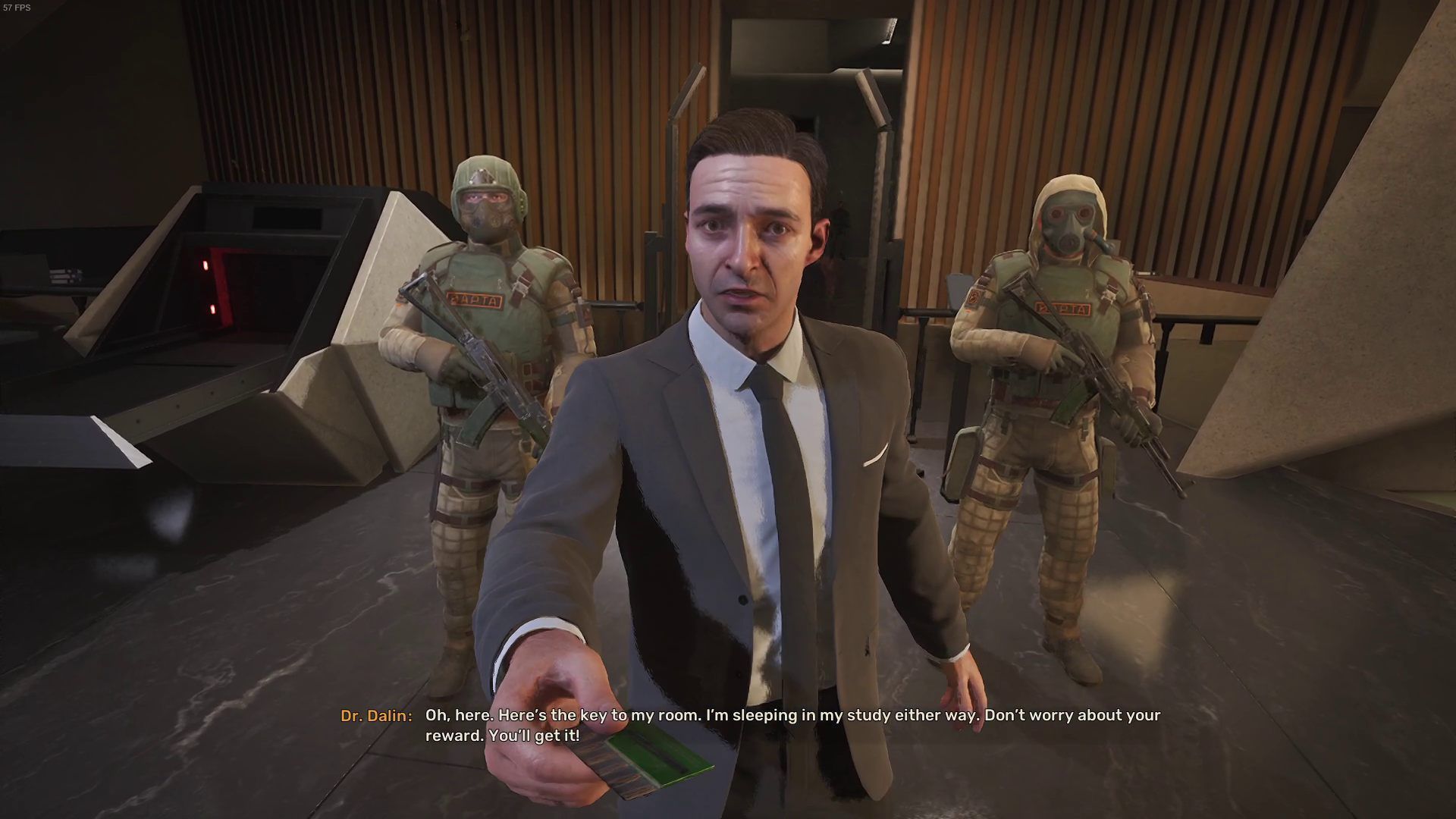 Przejdźcie przez most i dziedziniec prowadzący do wejścia. W głównym holu przywita Was Dalin, który zabierze od Was skaner. W zamian otrzymacie kartę dostępu do prywatnej kwatery naukowca, gdzie Skif będzie mógł odpocząć.