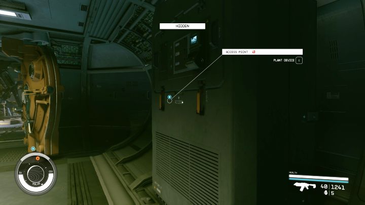 - Będąc w środku pomóżcie sobie użyciem drabiny, a dotrzecie na właściwy pokład. Kucnijcie i sprawdźcie, czy jesteście w ukrytym stanie. Dopiero wtedy podłóżcie urządzenie APU w porcie Access Point oznaczonym niebieską ikoną (obrazek). Jeśli w miejsce to spogląda strażnik, to zaczekajcie aż odejdzie lub się obróci.