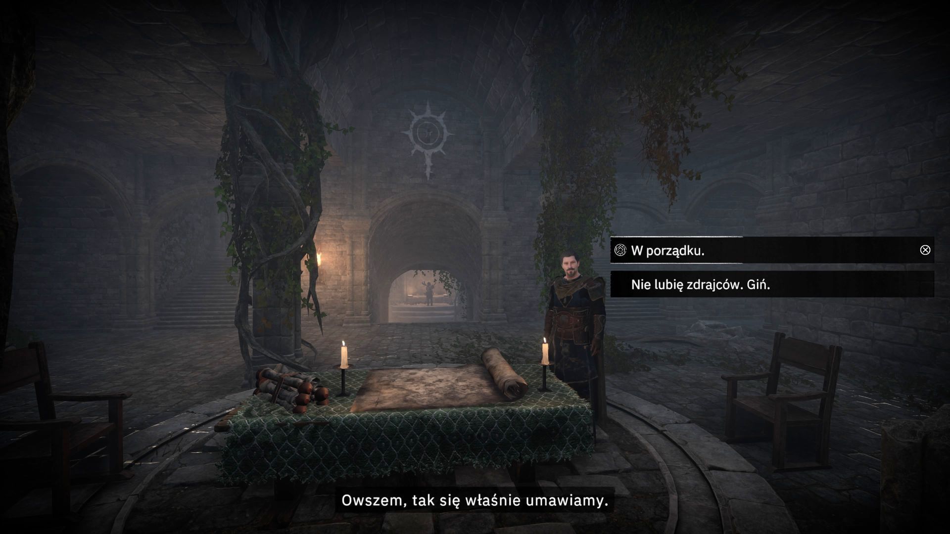 - Pojawi się pierwszy ważny wybór. Jeśli zgodzicie się na zabicie Galahada, to otrzymacie przepustkę i Breandan wskaże miejsce pobytu rycerza. Nie jest to ostateczny wybór, bo finalną decyzję w tej sprawie podejmiecie dopiero podczas konfrontacji z Galahadem (opis poniżej).