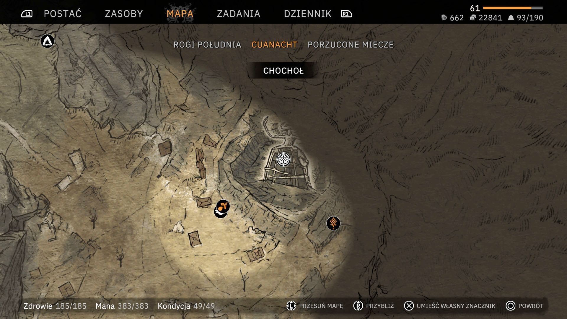 - W niewielkiej odległości na północny-zachód od znacznika celu misji jest lokacja Chochoł. Możecie zbliżyć się do niej z południowego-zachodu, przy czym odkryjecie, że główny most jest zniszczony.