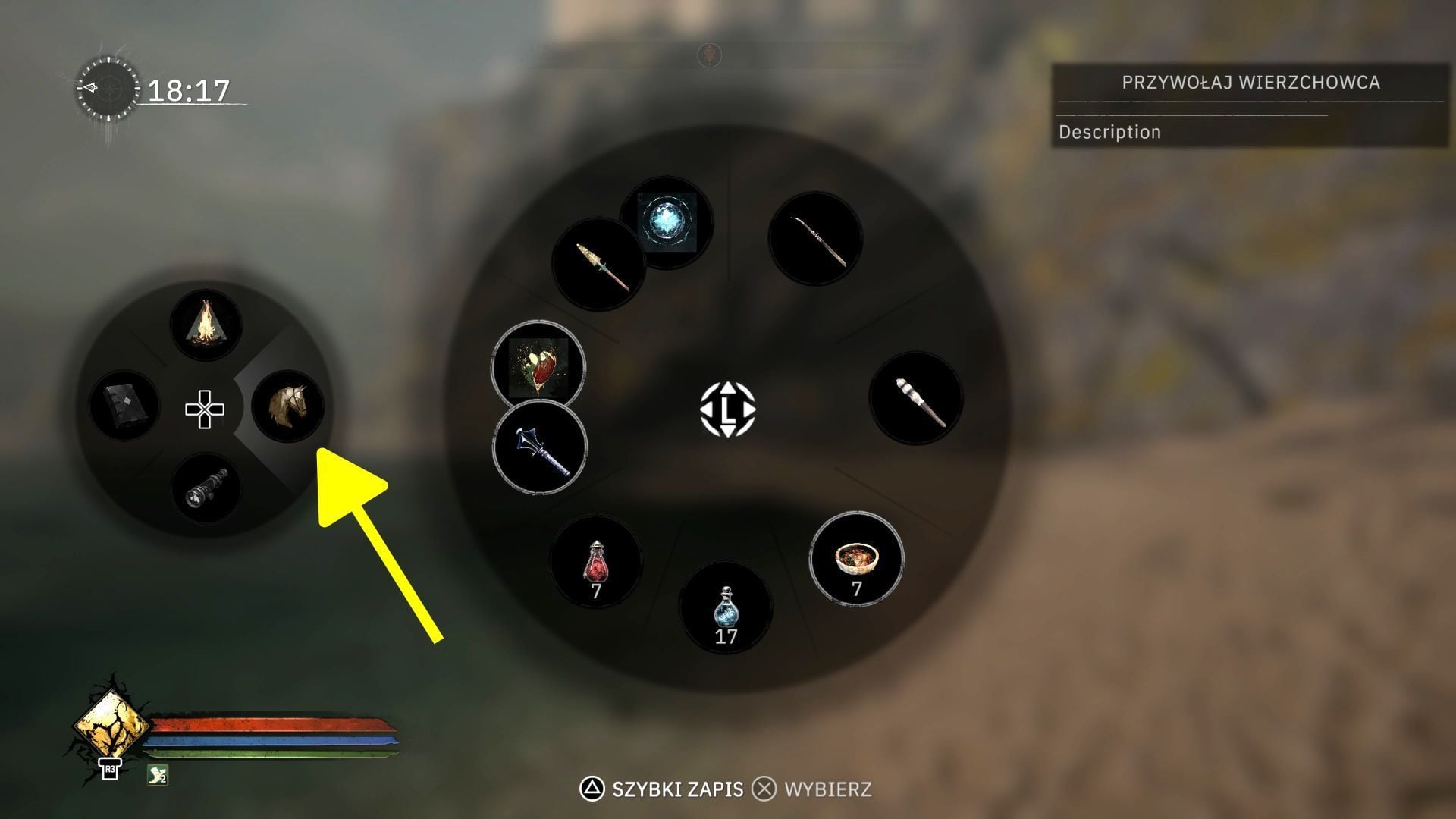 - Wierzchowiec domyślnie zacznie podążać za bohaterem, ale możecie go tymczasowo zgubić np. po wejściu do lochu czy skorzystaniu z szybkiej podróży. Gra pozwala przywoływać konia z poziomu koła szybkiego dostępu. Po wywołaniu rozwijanego menu wybierzcie ikonę konia z lewego koła (prawy kierunek na dpadzie grając na kontrolerze).