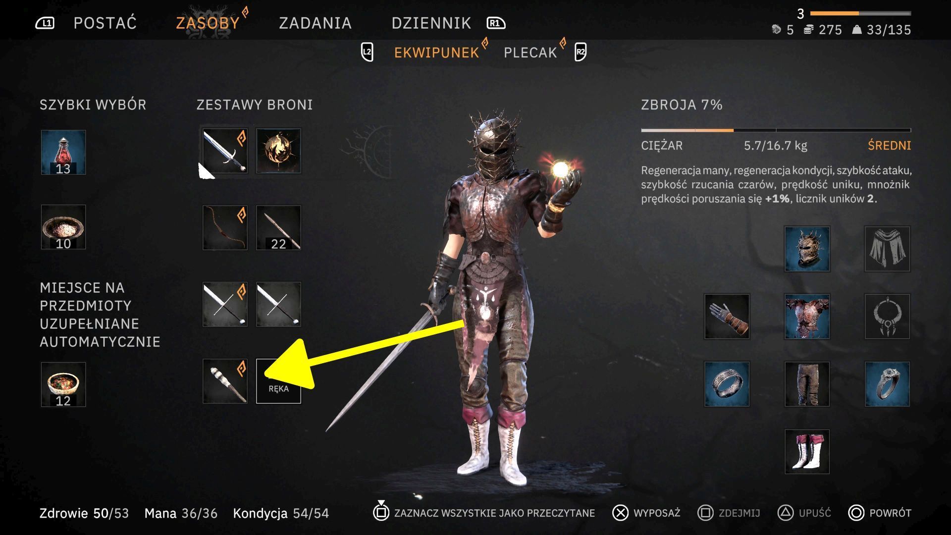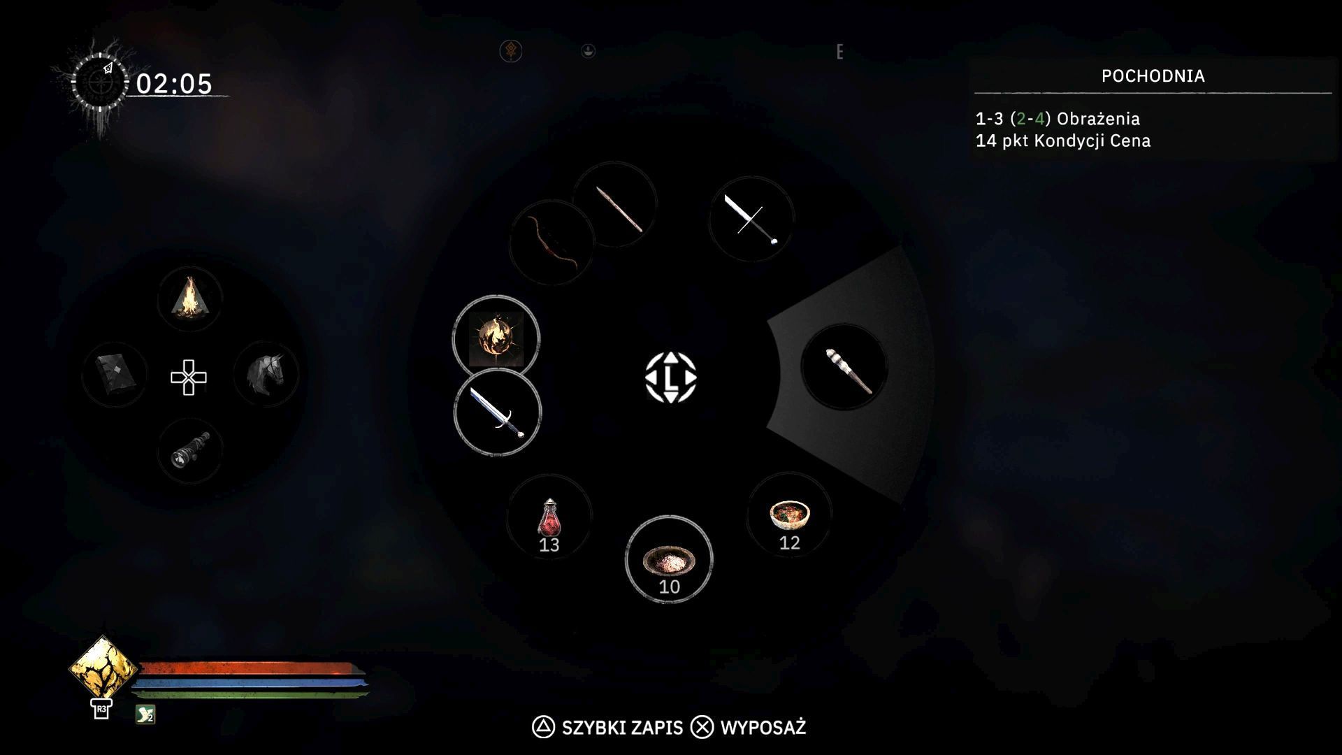 - Najlepiej wybrać osobny slot (np. ostatni czwarty w przykładzie z naszego obrazka). Pochodnia wymaga tylko 1 ręki, a więc "do pary" z nią możecie umieścić w drugim slocie np. broń jednoręczną albo dowolny czar.