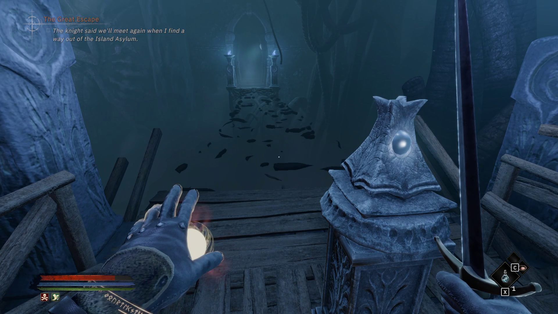 Podczas ucieczki z samouczkowej lokacji traficie do pomieszczenia podzielonego przez szeroką przepaść. Obok krawędzi natraficie na tajemniczy postument, z którym będziecie mogli wejść w interakcję. Przywoła on widmowy most, który jednak nie zmaterializuje się do końca i nie pozwoli Wam przejść na drugą stronę.