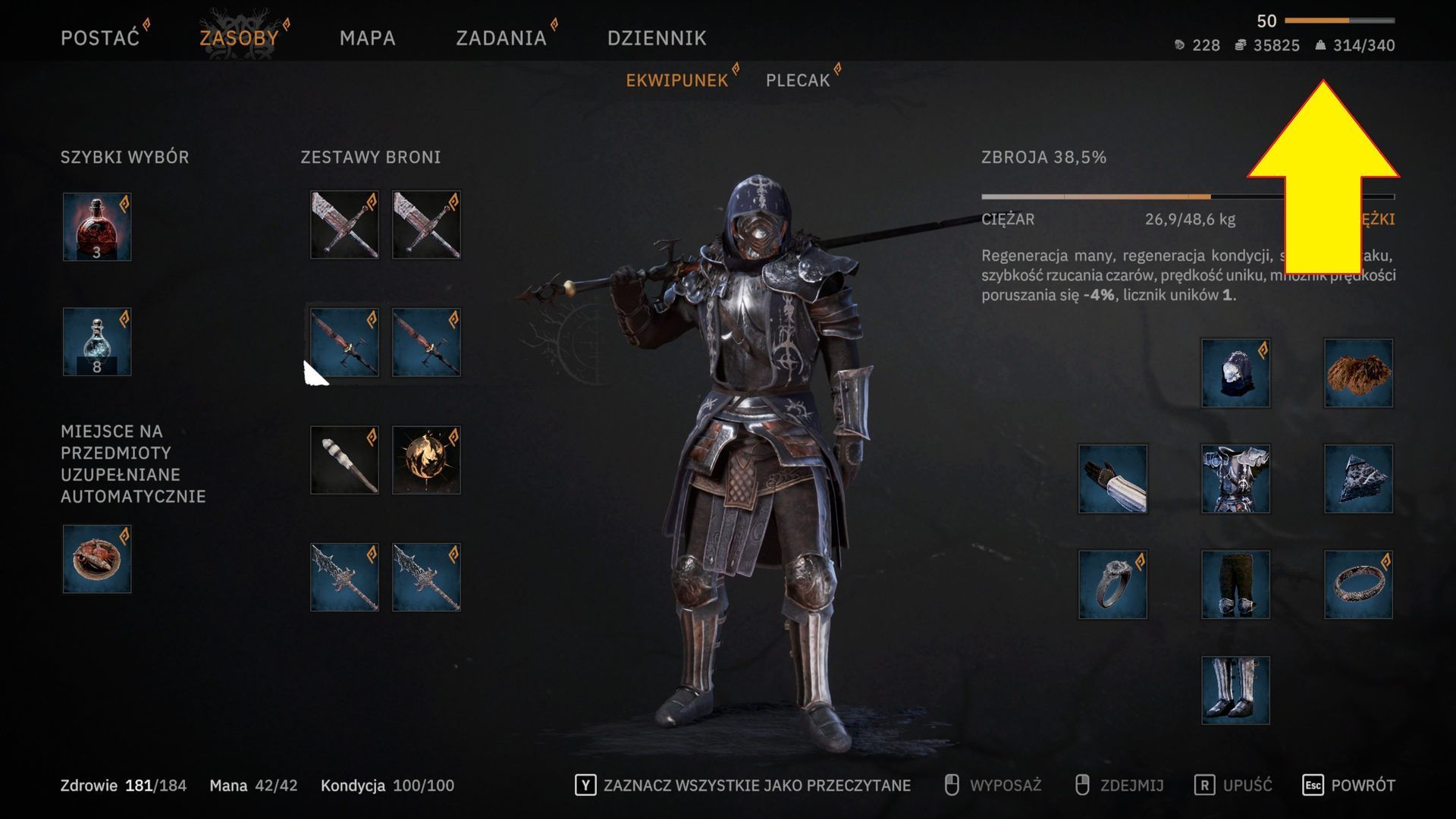 Udźwig postaci możecie w dowolnym momencie sprawdzić wchodząc na ekran bohatera i spoglądając na pasek w prawym górnym rogu ekranu. Gdy limit zostaje przekroczony, bohater traci możliwość biegu i wykonywania uników, a jego ruchy stają się znacznie wolniejsze.