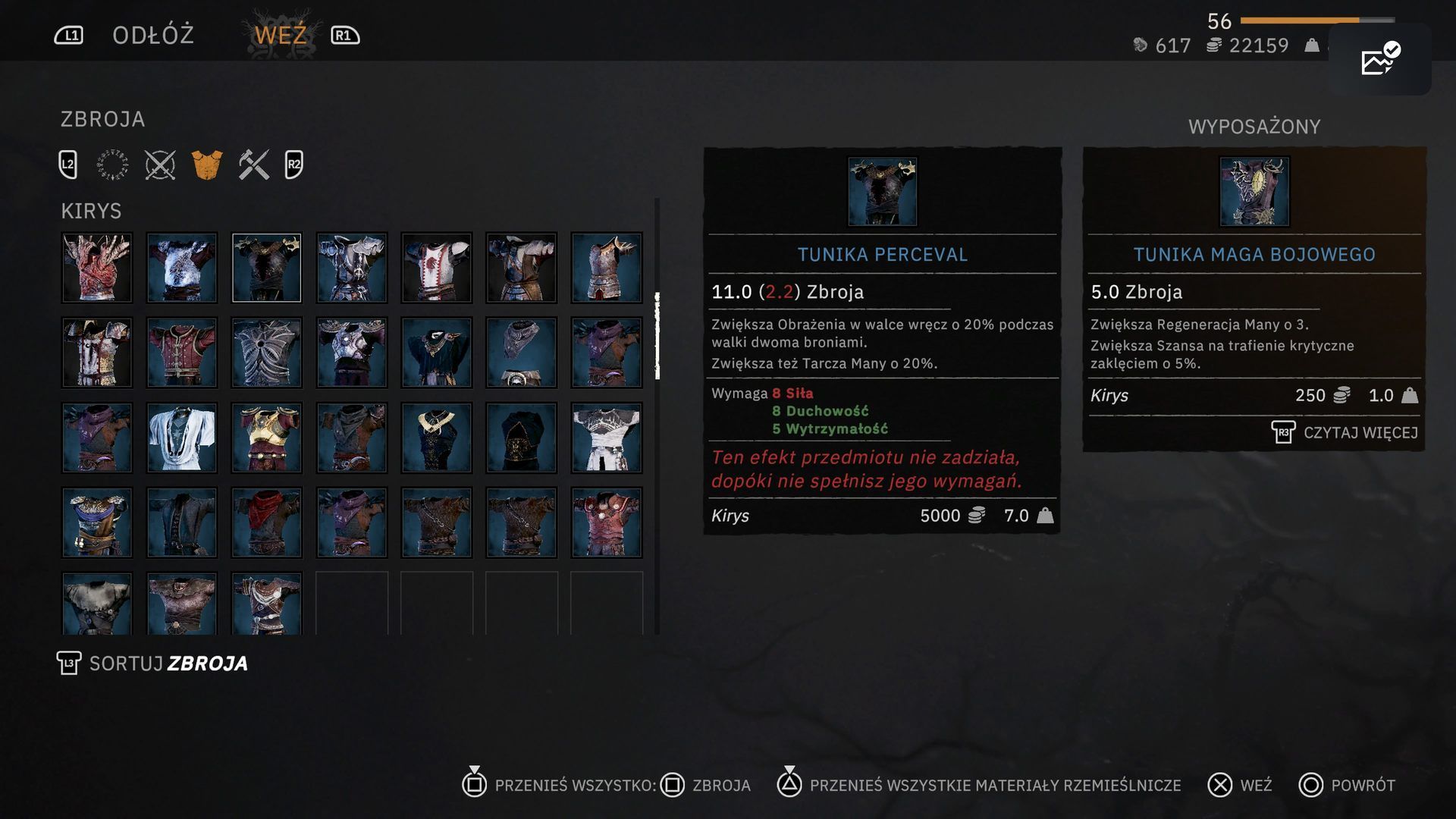 Żeby móc korzystać z wybranego pancerza, konieczne jest spełnienie wymagań związanych z daną statystyką lub statystykami. Najczęściej są to atrybuty związane z właściwościami przedmiotu. Możecie je podejrzeć najeżdżając na wybrany element na ekranie ekwipunku.