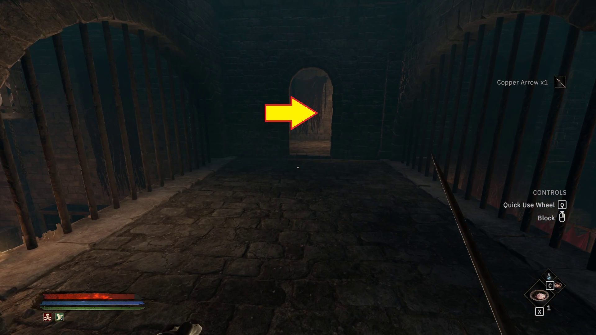 - Pierwszą łopatę znajdziecie już w tutorialowej lokacji podczas ucieczki z więzienia. Stoi ona przy ścianie, w korytarzu za pomieszczeniem z półkolistymi otworami z kratami.