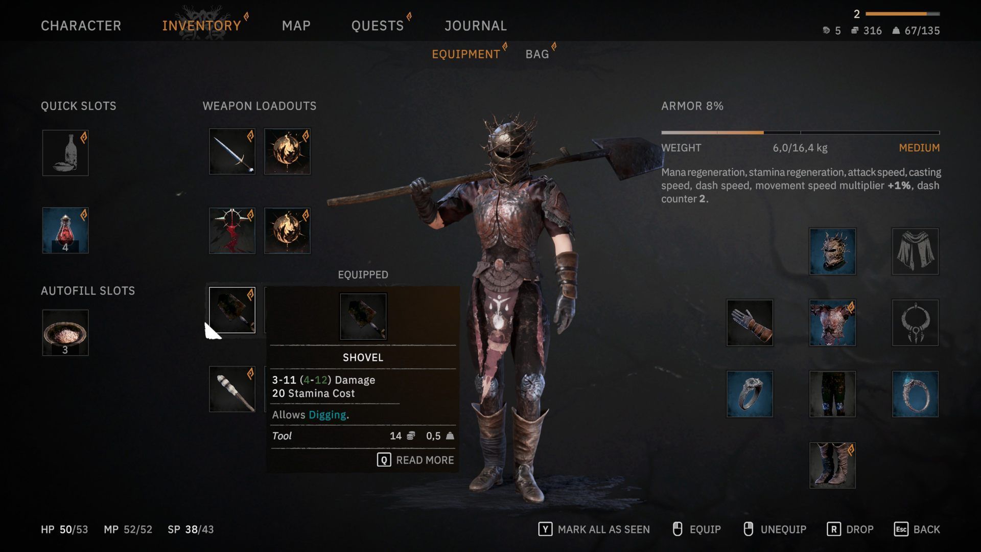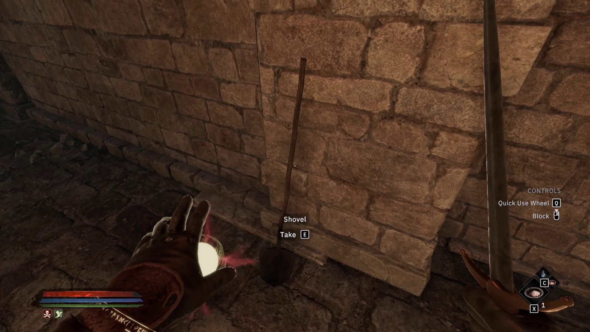 Z łopaty możecie korzystać, jak ze zwykłej broni dwuręcznej. Nie sprawdza się w tej roli jednak zbyt dobrze przez marne statystyki.