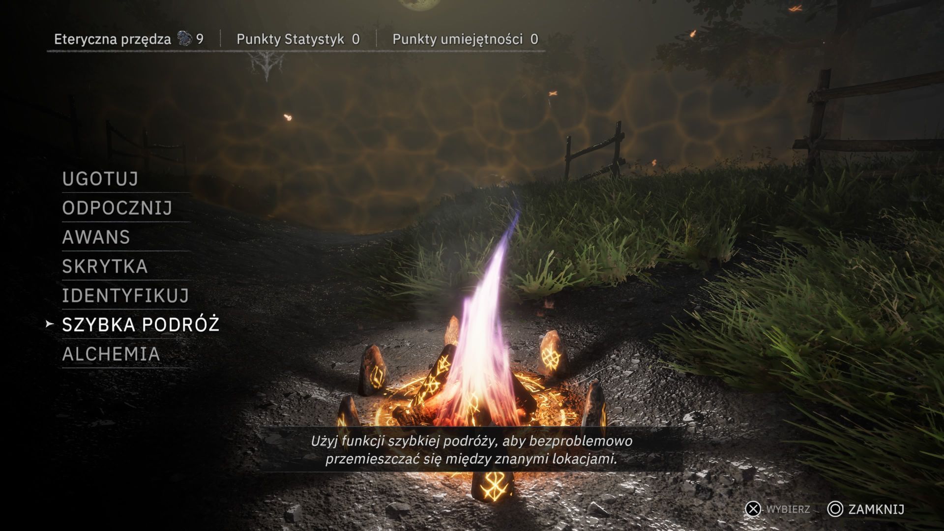 - Mniej oczywista opcja to aktywacja szybkiej podróży z poziomu ogniska. Musicie najpierw rozstawić gdzieś ognisko w świecie gry, a następnie wydać 10 eterycznej przędzy do wzmocnienia ogniska. Dopiero wtedy na liście opcji pojawi się szybka podróż (powyższy obrazek).