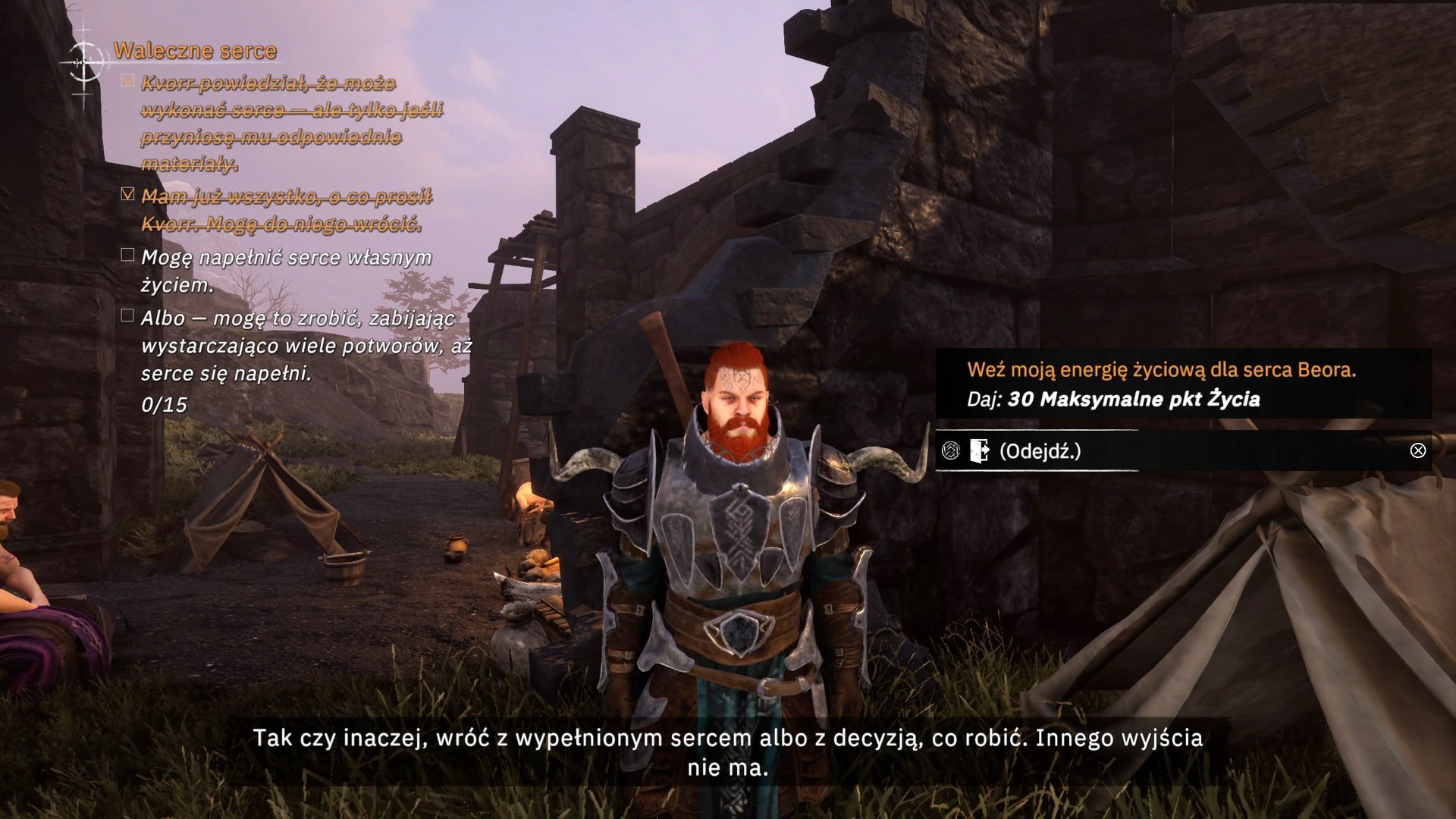 - Pogadajcie z Beorem, który po przekazaniu mu serca powróci do sił. Dowiecie się, że jest plan wykucia nowego serca i rozpocznie się powiązany z tym poboczny quest Waleczne serce.