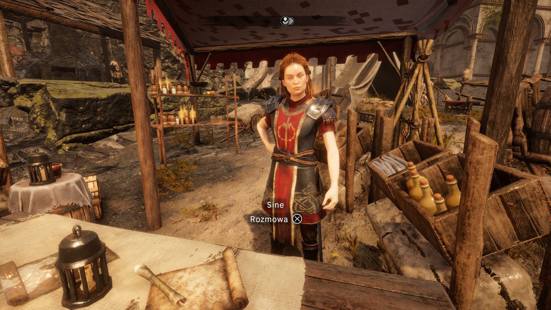 - Docelowo Sine może Wam zaproponować spędzenie wspólnych chwil w jej namiocie. Po przystaniu na jej propozycję odczekajcie do około godziny 22:00. Namiot Sine znajduje się za kramikiem, przy którym stoi za dnia.
