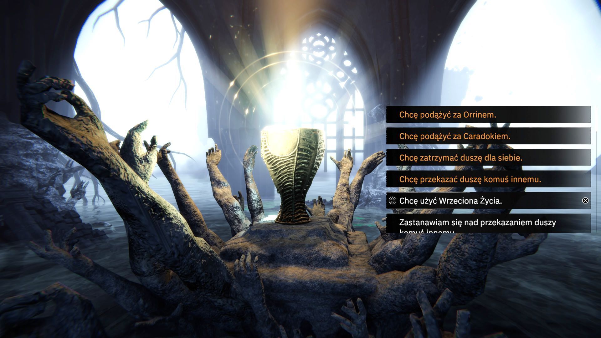 - Jeśli spełnione zostały wszystkie wymagania, to na liście dostępna będzie piąta opcja dialogowa Chcę użyć Wrzeciona życia (ma ona biały kolor, ale jest pełnoprawnym wyborem).