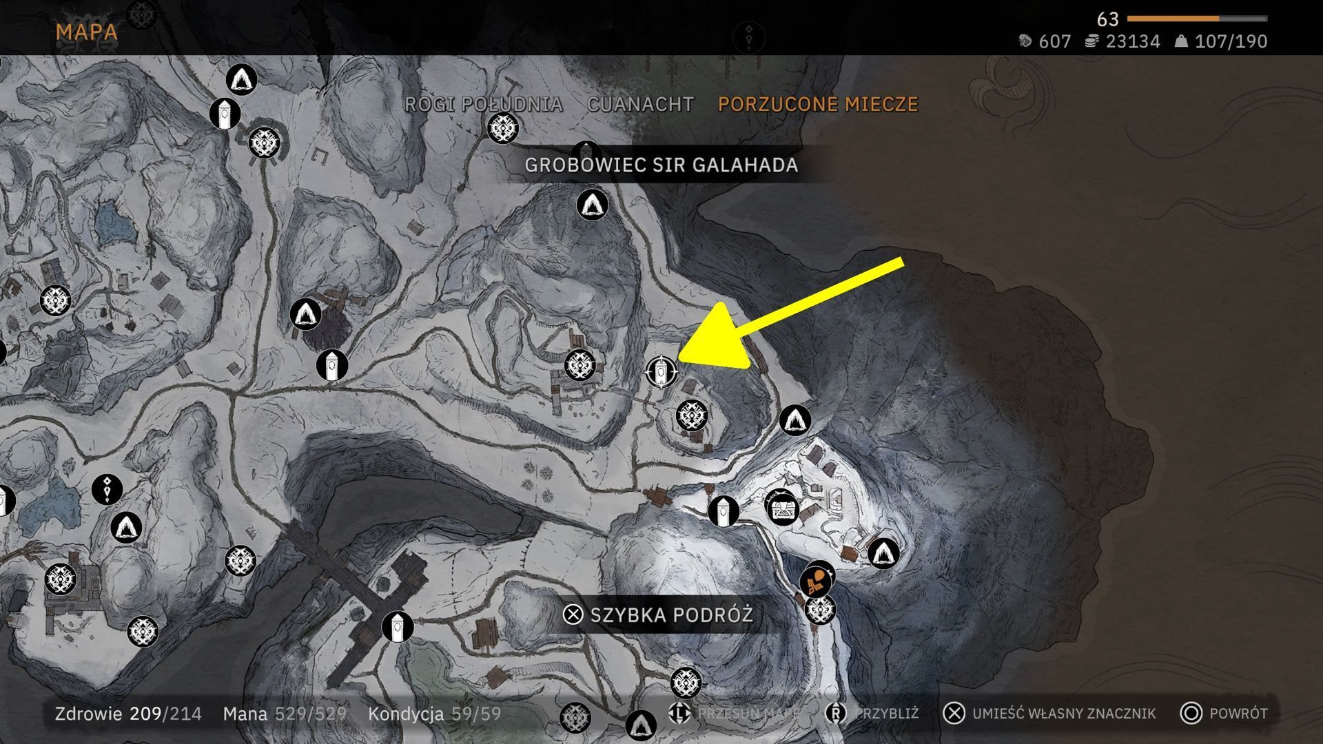 - Ostatnie miejsce z listy lokacji wymaganych do odwiedzenia to Grobowiec Sir Galahada również z regionu Porzucone Miecze. Jest on niedaleko na północ od Grobowca Rycerza i w tym samym miejscu jest też punkt szybkiej podróży (powyższy obrazek). Wejdźcie w interakcję z piedestałem z symbolem korony żeby odblokować wejście.