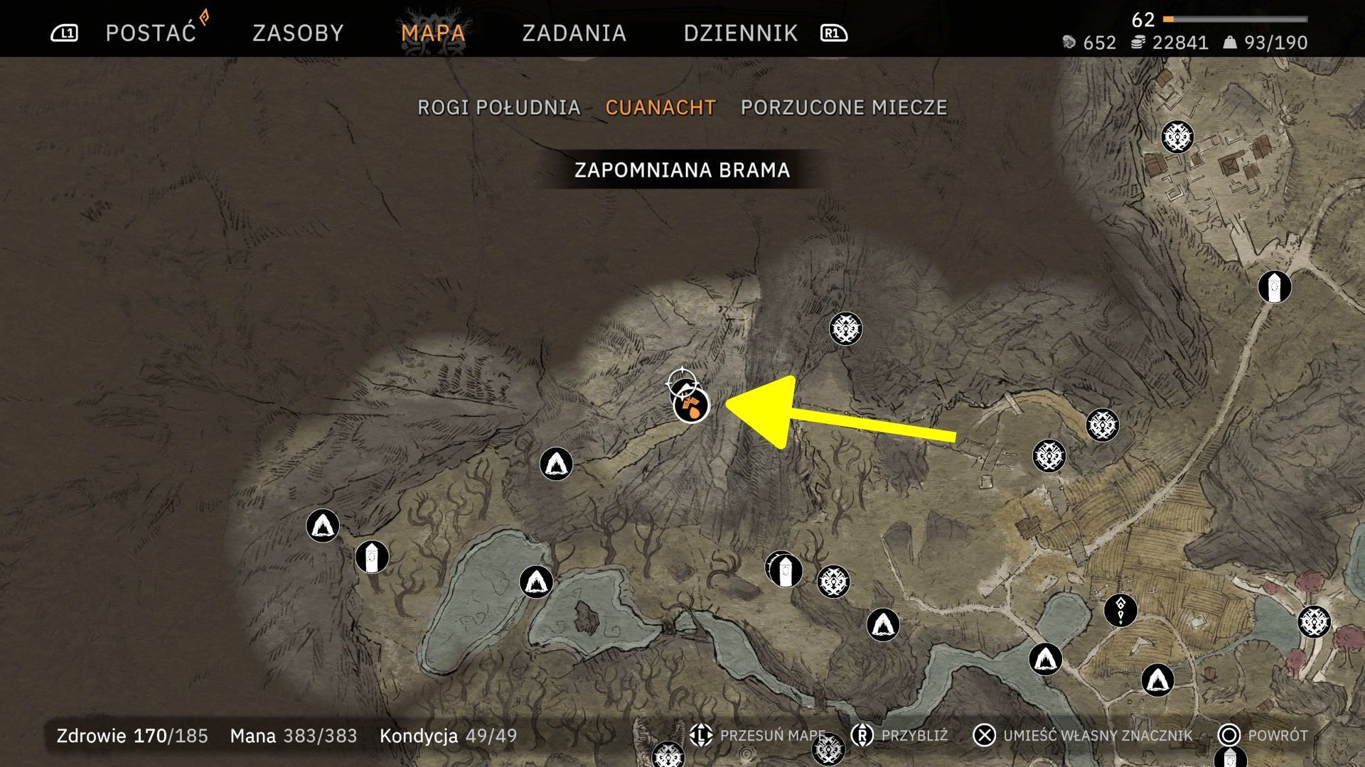 - Celem podróży jest lokacja Zapomniana brama z północno-zachodniej części drugiego regionu Cuanacht. Możecie tam dotrzeć ze wschodu (strzałka na naszym obrazku), przechodząc po kamiennym moście i odnajdując obozowisko dezerterów.