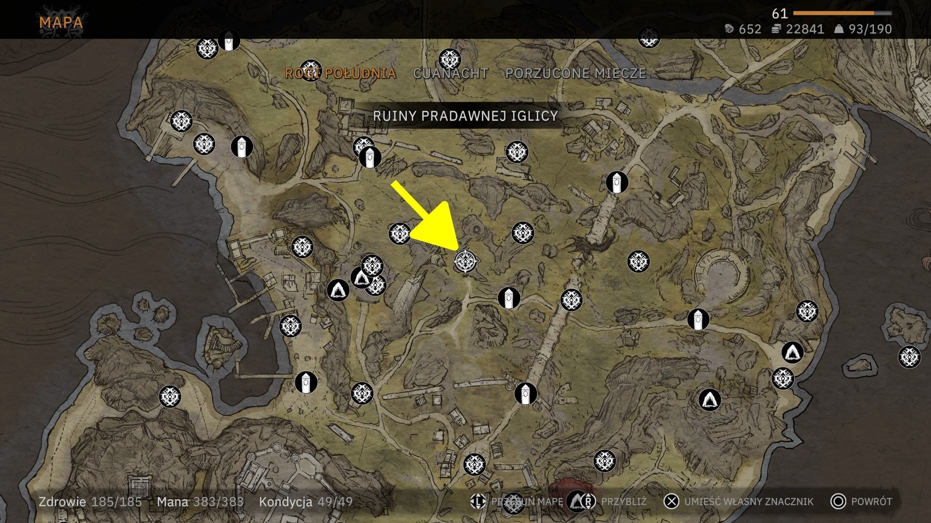 - Wyruszcie do lokacji Ruiny Pradawnej Iglicy z centralnej części regionu Rogi Południa. Niedaleko jest punkt szybkiej podróży o identycznej nazwie.