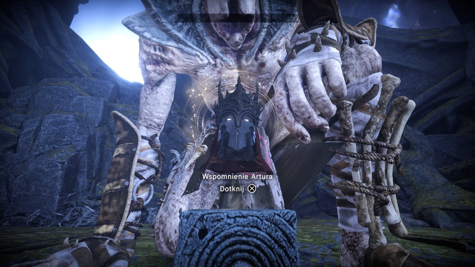 - Wejdźcie w interakcję z płytą grobowca (powyższy obrazek), a przeniesiecie się do osobnej lokacji. Pokonajcie w niej Upiornego żniwiarza i aktywujcie most żeby dotrzeć do miejsca z mieczem Arondight. Powróćcie do Lancelota żeby z nim ponownie pogadać. Odblokujecie wspomnienie Artura i możecie zebrać zestaw elementów pancerza Sir Lancelota.