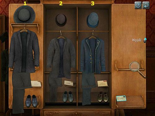 Jeśli chodzi o drugi zestaw, o tym, czy jest to odzienie urzędnika czy robotnika, przesądzi zbadanie przez lupę spodni - są poplamione granatowym atramentem. Połóż więc przy tym stroju zaadresowaną do urzędnika kopertę z beżowym znaczkiem. Gdy do dobrze dobranego przebrania dołożysz właściwą kopertę, Watson odpowiednio to skomentuje i nie da się już przenosić poszczególnych części garderoby. Prawidłowo skompletowane kostiumy na fotce powyżej.