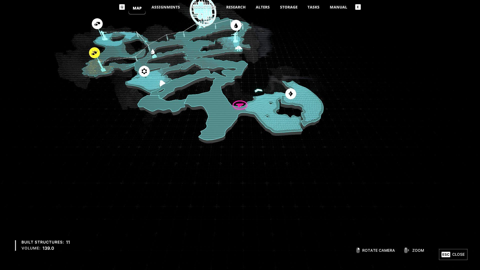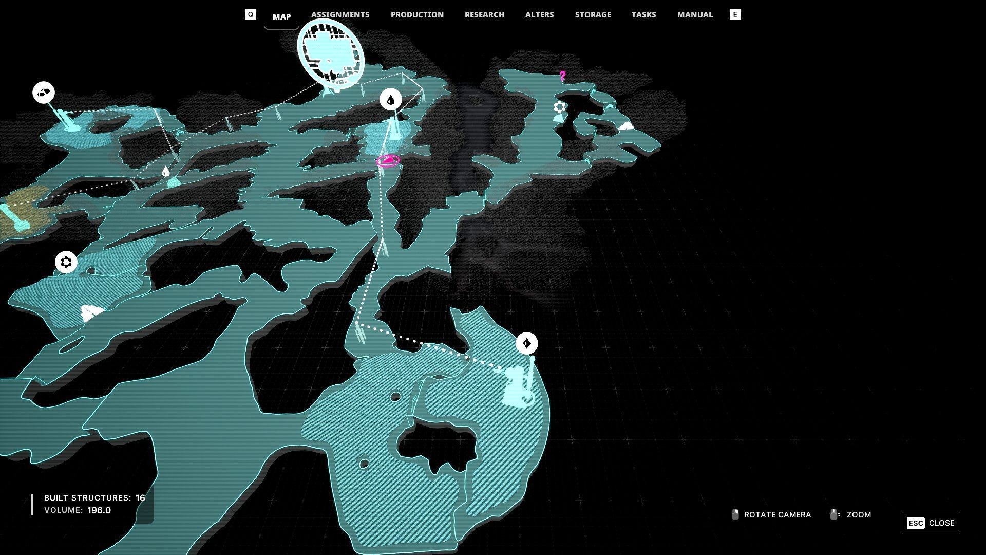 - W przykładzie z obrazka stworzyliśmy połączenie ze złożem substancji organicznych, ale możecie też ustanowić połączenie ze złożem rapidium. W obu przypadkach konieczne będzie zużycie więcej niż 3 pylonów. Dodatkowo wymagane może być ponowne użycie wiertła do zburzenia innych blokad skalnych.