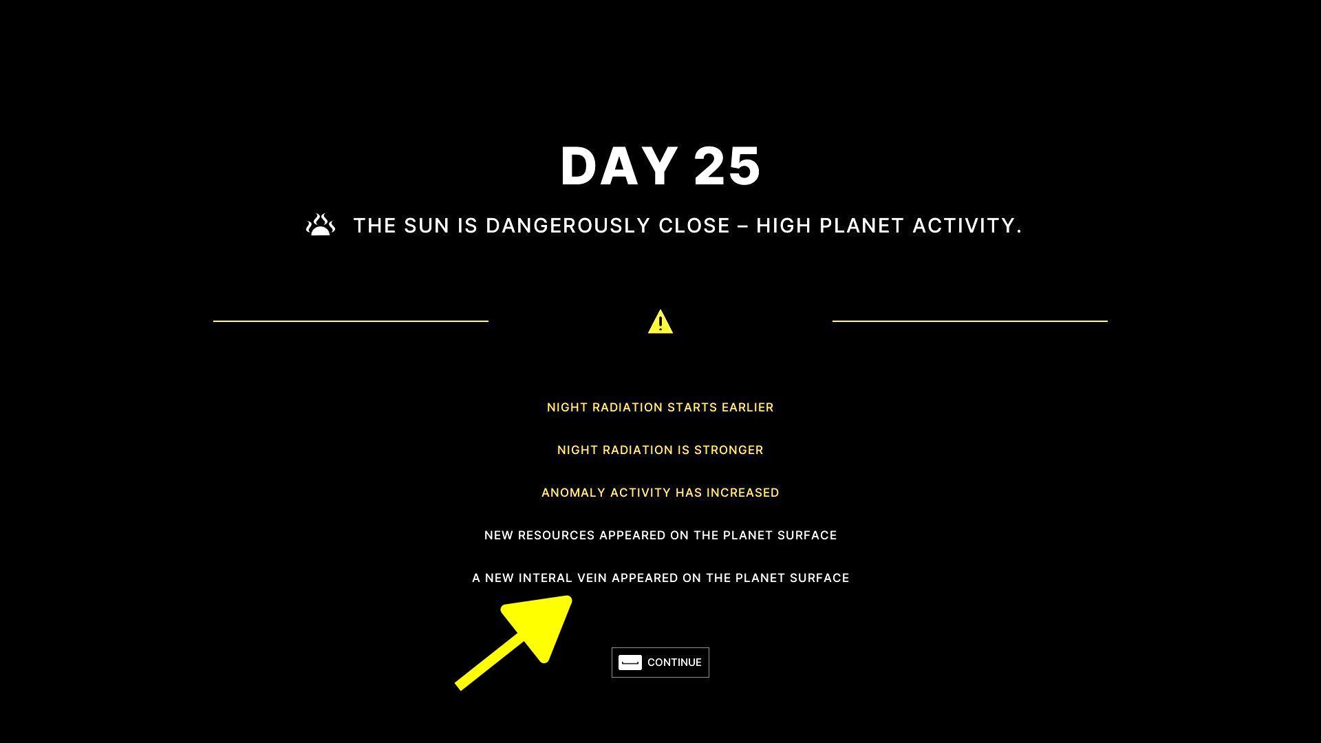 - Kontynuujcie grę, a w kluczowych momentach otrzymacie ostrzeżenie o zbliżającym się Słońcu i powiązanych z tym zmianach oraz wydarzeniach. Na liście zmian może być informacja o pojawieniu się nowej żyły interalu (przykład na obrazku).